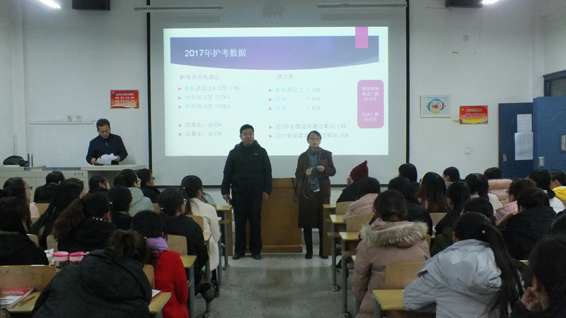 為了進(jìn)一步提高我系學(xué)生的專業(yè)水平和護(hù)考過關(guān)率,讓2018屆畢業(yè)生更好地應(yīng)對(duì)護(hù)士資格考試,12月20日晚,護(hù)理系在明遠(yuǎn)樓211教室舉辦了以護(hù)考為主題的講座,15級(jí)護(hù)理、助產(chǎn)專業(yè)共100余人聆聽了此次講座。護(hù)理系黨總支書記張建輝、系主任韓曉萍參加講座并講話。