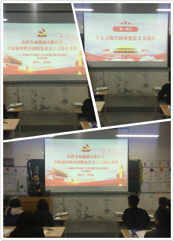 12月20日晚自習時間,在17級計算機網(wǎng)絡(luò)大專班教室,電信系黨員教師張偉東同志給學生們以《深入學習重點解讀十九屆大會議報告精神》為主題,對十九大報告進行了全方位的宣講解讀。