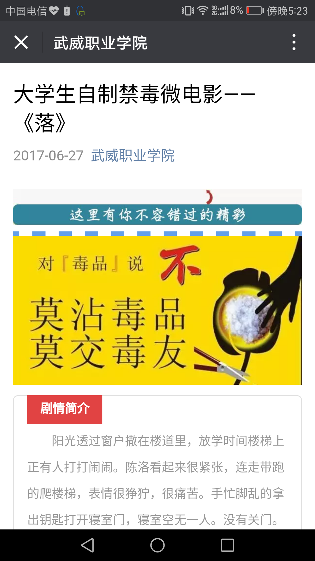 活動期間,保衛(wèi)處、各院系充分利用校園廣播、宣傳欄、板報、校園網(wǎng)絡(luò)等媒體集中發(fā)聲,召開“健康人生,綠色無毒”主題班會、征文比賽、禁毒知識競賽、觀看禁毒影片、網(wǎng)上參觀禁毒展覽等多種形式,倡導(dǎo)廣大師生陽光健康生活,遠離毒品危害,在校園內(nèi)、師生間營造了濃厚的防毒禁毒氛圍。