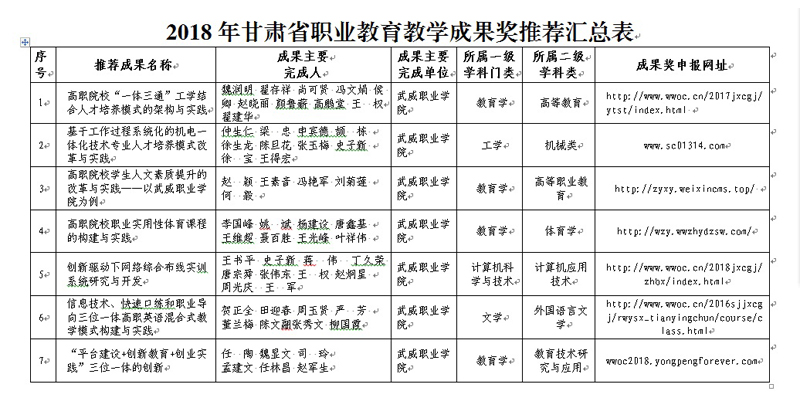 根據(jù)甘肅省人力資源和社會(huì)保障廳、甘肅省教育廳《關(guān)于開(kāi)展2018年甘肅省職業(yè)教育教學(xué)成果獎(jiǎng)評(píng)選表彰工作的通知》精神,經(jīng)個(gè)人申報(bào),學(xué)院審核,決定擬推薦以下所提交紙質(zhì)材料、電子材料、申報(bào)網(wǎng)站等符合申報(bào)要求的12項(xiàng)教學(xué)成果參評(píng)2018年甘肅省職業(yè)教育教學(xué)成果獎(jiǎng),現(xiàn)予以公示。