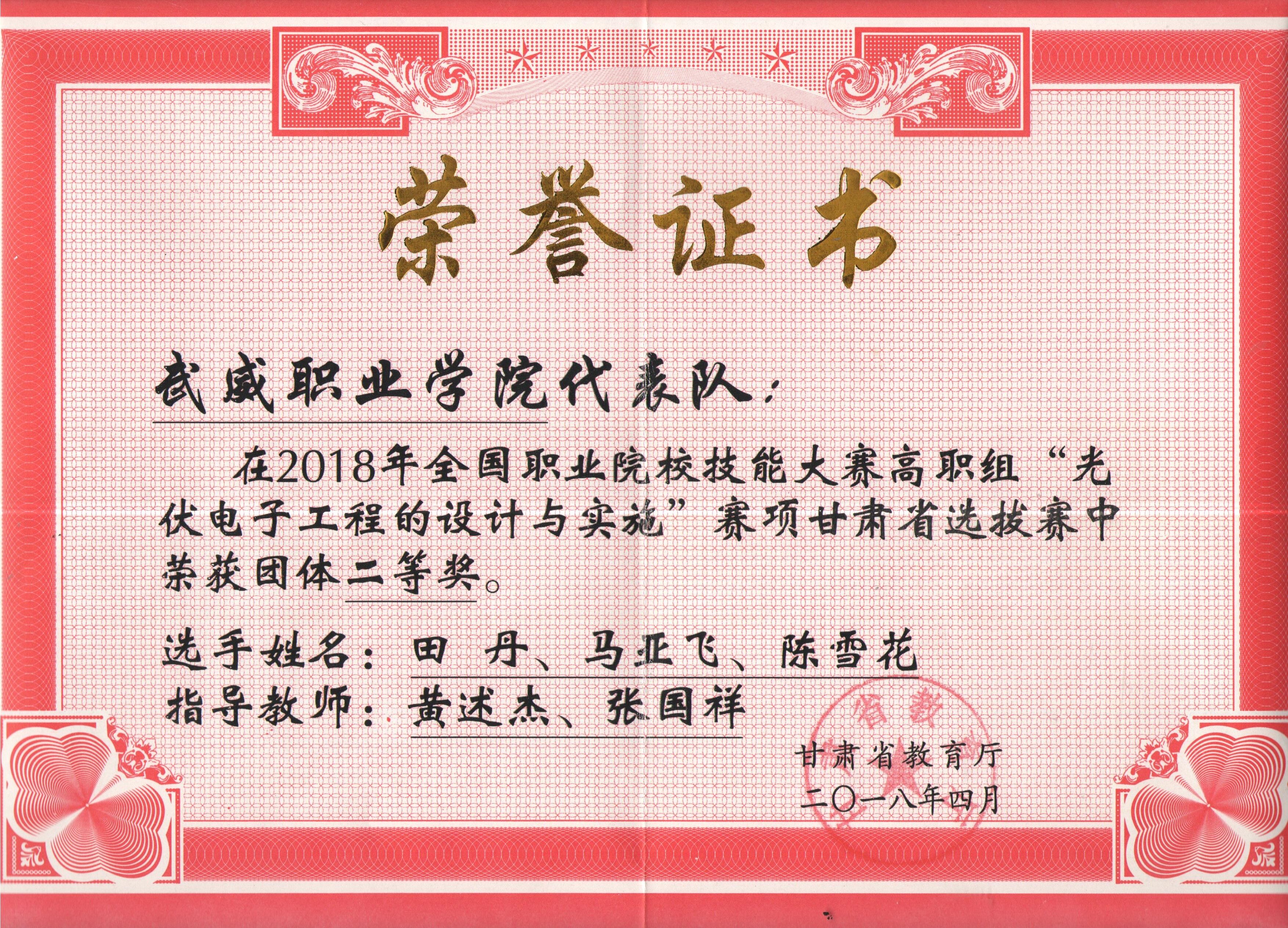 4月14日,2018年全國(guó)職業(yè)院校技能大賽“光伏電子工程的設(shè)計(jì)與實(shí)施”賽項(xiàng)甘肅省選拔賽在甘肅林業(yè)職業(yè)技術(shù)學(xué)院舉行。此次大賽有蘭州石化職業(yè)技術(shù)學(xué)院、甘肅林業(yè)職業(yè)技術(shù)學(xué)院、武威職業(yè)學(xué)院等6所院校的11支代表隊(duì)33名選手參加。由我院能源工程系黃述杰、張國(guó)祥老師指導(dǎo),田丹、馬亞飛、陳雪花三名學(xué)生組成的武威職業(yè)學(xué)院一隊(duì)榮獲二等獎(jiǎng)。