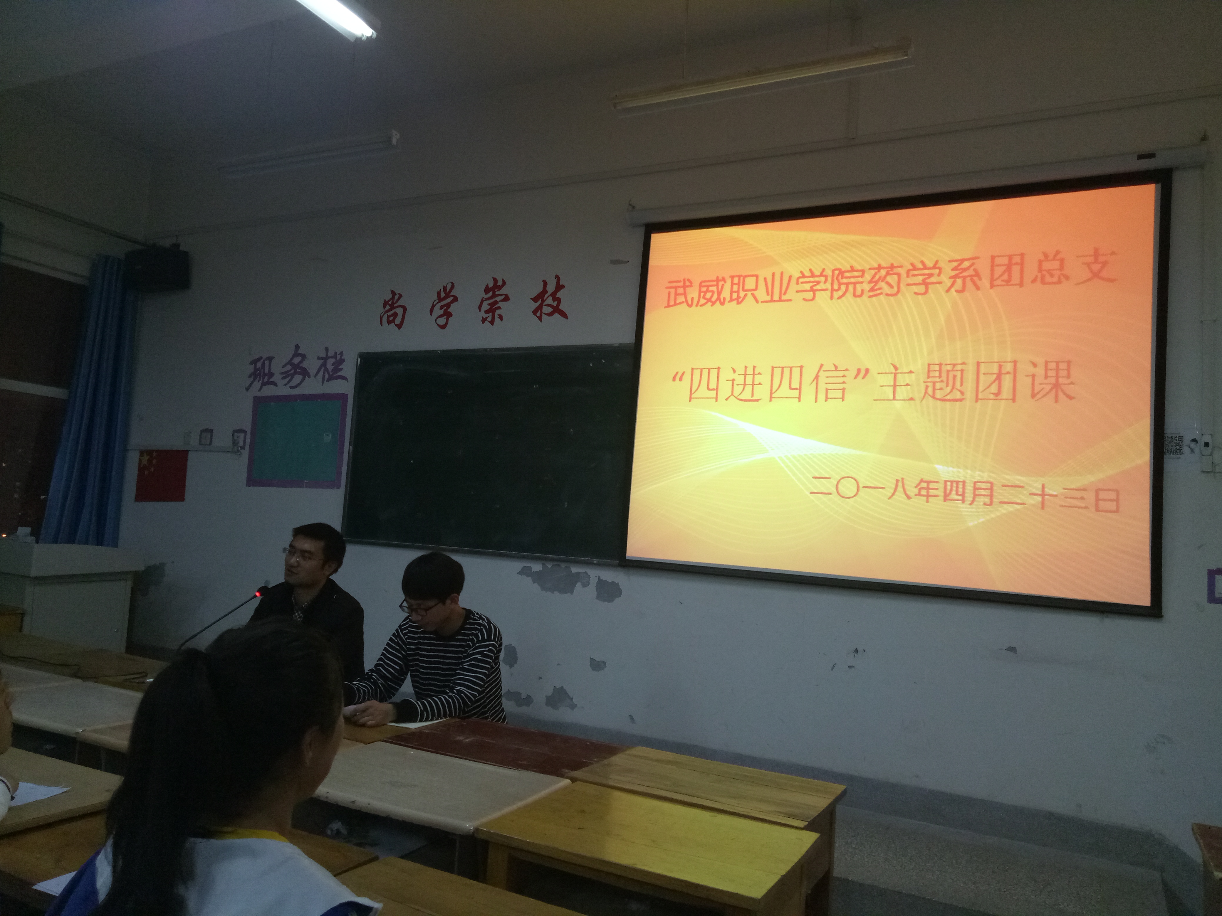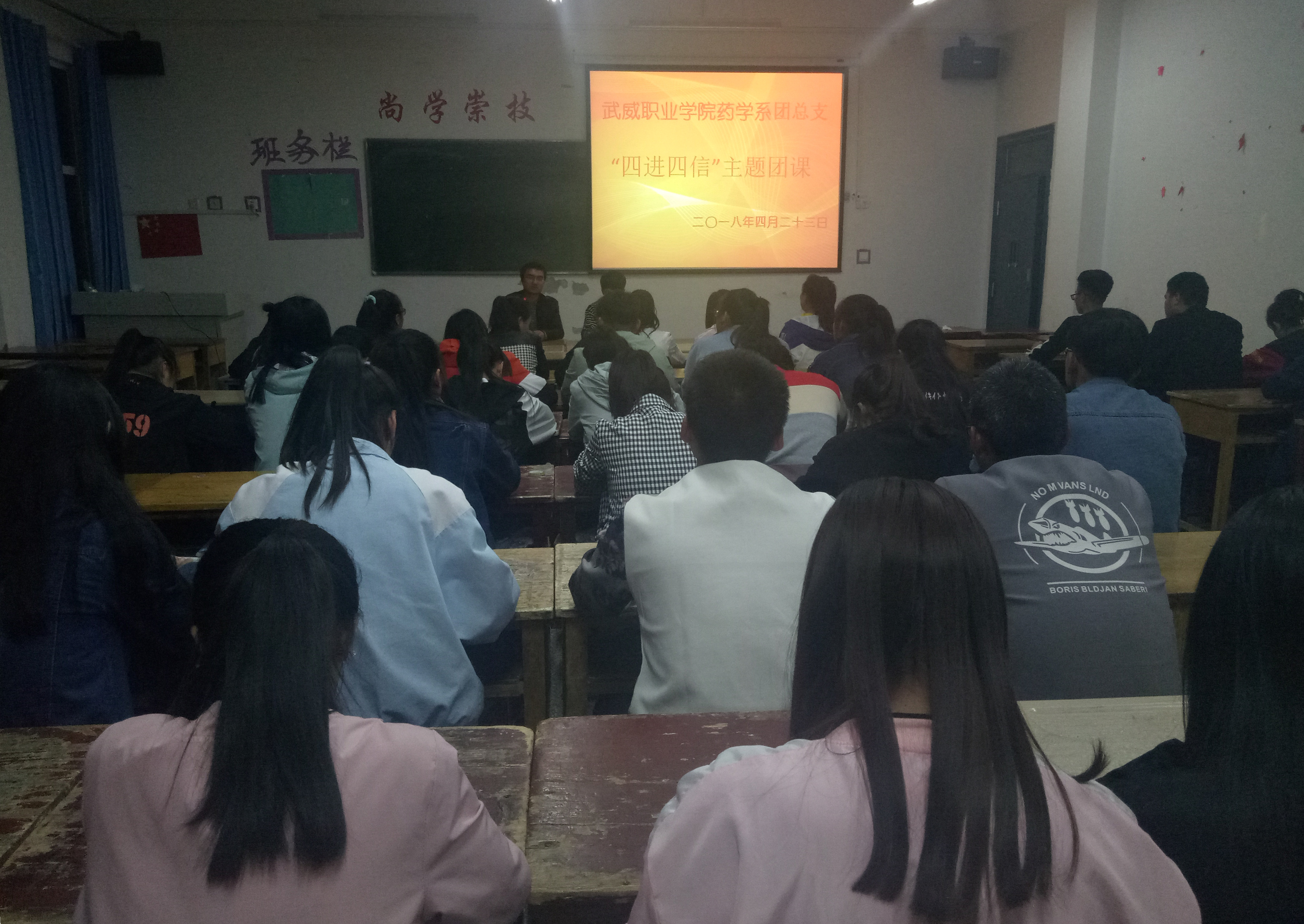 為深入學(xué)習(xí)宣傳貫徹習(xí)近平新時代中國特色社會主義思想,堅持以習(xí)近平新時代中國特色社會主義思想武裝團(tuán)員干部和團(tuán)員青年學(xué)生頭腦,積極推進(jìn)各項工作開展。2018年4月23日晚,藥學(xué)系團(tuán)總支組織16級團(tuán)員青年及17級入團(tuán)積極分子在明遠(yuǎn)樓501教室開展關(guān)于“四進(jìn)四信”的主題團(tuán)課活動,團(tuán)課由要藥學(xué)系團(tuán)總支書記陳輝生主持。