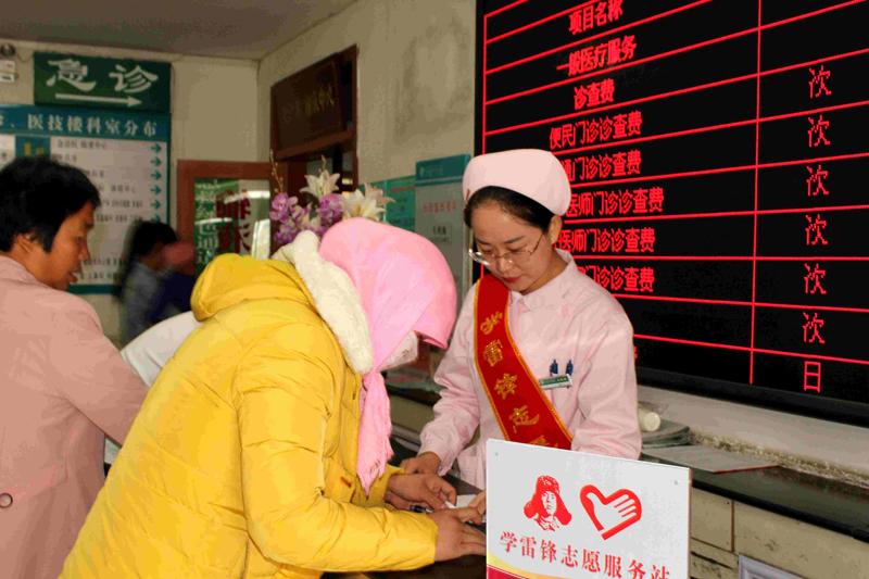 學(xué)雷鋒志愿服務(wù)站工作人員主要由年輕護(hù)士們擔(dān)任。她們身著護(hù)士裝,佩戴印有“學(xué)雷鋒志愿者服務(wù)”字樣綬帶,主動(dòng)為患者服務(wù)。志愿者們提供的主要服務(wù)項(xiàng)目有:在門診為老、弱、病、殘、孕等患者提供輪椅擔(dān)架租借。為患者提供開水、就醫(yī)導(dǎo)診、戒煙勸導(dǎo)、醫(yī)學(xué)人文關(guān)懷、慢性病知識(shí)普及和健康宣教等便民利民服務(wù),受到了患者及家屬的一致好評(píng)。