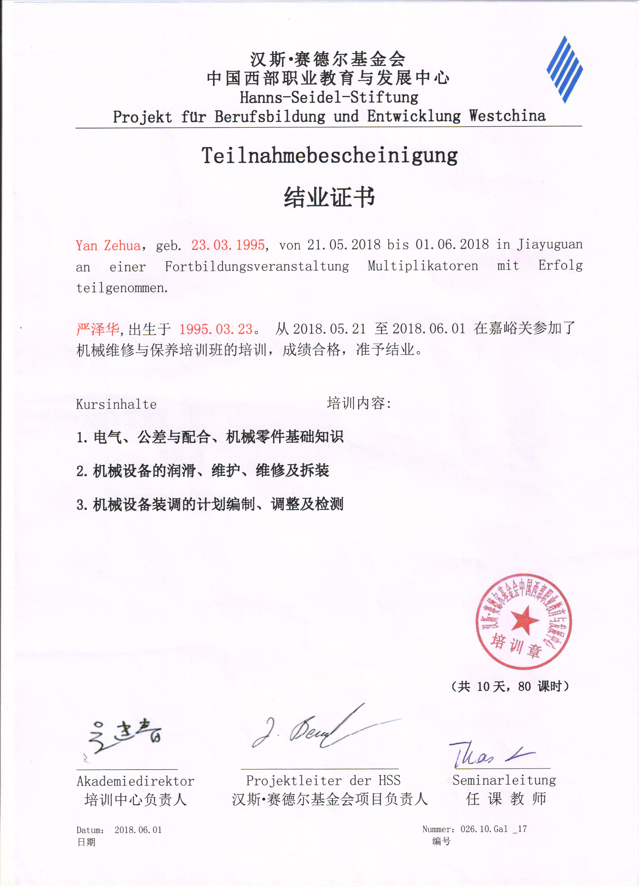 培訓(xùn)證書--參加漢斯·賽德爾基金會(huì)中國西部職業(yè)教育與發(fā)展中心培訓(xùn)