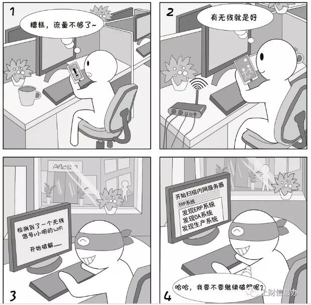 無線路由器有較多的安全隱患,比如之前的wep認證能很輕易破解。個人架設無線路由器,如果配置不當,家用最多導致蹭網(wǎng)或個人資料泄露,但在單位使用可能會導致內(nèi)網(wǎng)被入侵,單位機密、客戶資料泄密,后果不堪設想。