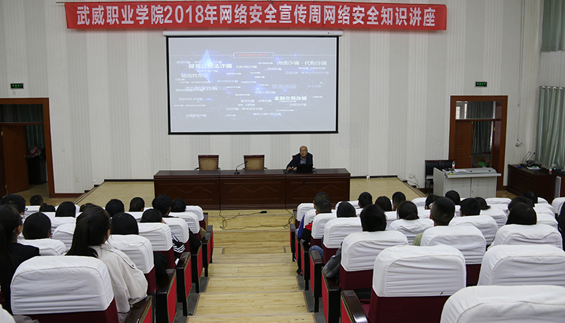 為深入學(xué)習(xí)宣傳貫徹習(xí)近平總書記在全國網(wǎng)絡(luò)安全和信息化工作會(huì)議上“深入開展網(wǎng)絡(luò)安全知識(shí)技能宣傳普及,提高廣大人民群眾網(wǎng)絡(luò)安全意識(shí)和防護(hù)技能”的重要講話精神,按照甘肅省教育廳、武威市網(wǎng)信辦關(guān)于開展2018年國家網(wǎng)絡(luò)安全宣傳周活動(dòng)的要求。9月18日下午,學(xué)院在正德廳舉辦了“網(wǎng)絡(luò)安全與《網(wǎng)絡(luò)安全法》”的專題講座,師生代表200余人參加。