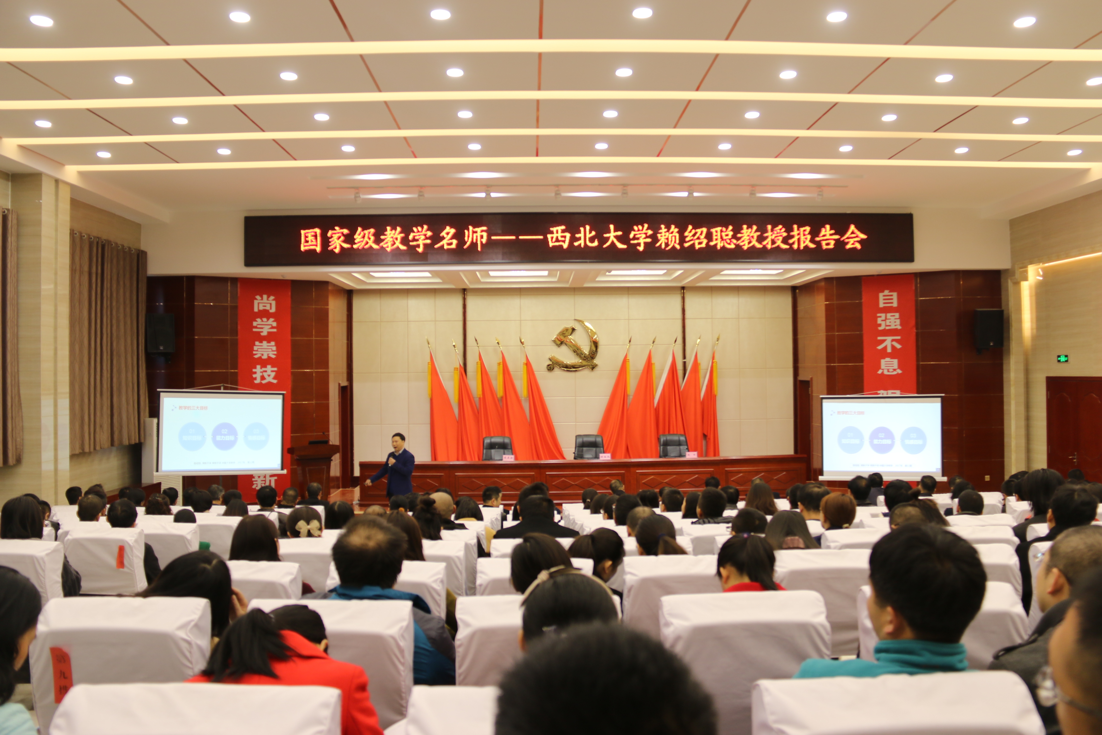 11月11日上午,西北地區(qū)高校教師教學(xué)發(fā)展中心聯(lián)盟“名師西部高校行”走進(jìn)我院。國(guó)家級(jí)教學(xué)名師、西北大學(xué)副校長(zhǎng)賴紹聰教授作題為“如何做好課程教學(xué)設(shè)計(jì)”的專題報(bào)告。聯(lián)盟執(zhí)行秘書長(zhǎng)、西安交通大學(xué)教師教學(xué)發(fā)展中心專家吉康敏參加了報(bào)告會(huì),報(bào)告會(huì)由學(xué)院黨委書記、院長(zhǎng)趙明教授主持。