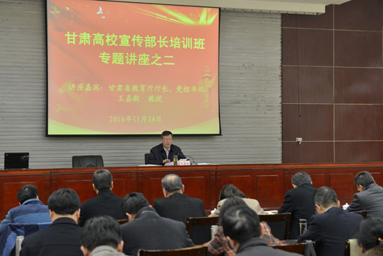 王嘉毅在專題講座中介紹了甘肅高等教育現(xiàn)狀、存在問(wèn)題和“十三五”發(fā)展目標(biāo)。他指出,高校宣傳思想工作主要任務(wù)要把學(xué)習(xí)貫徹落實(shí)黨的十八大以來(lái)的重大部署,特別是六中全會(huì)精神和習(xí)近平總書(shū)記系列重要講話精神作為重要任務(wù)來(lái)抓;要把貫徹落實(shí)中宣部、教育部黨組《關(guān)于加強(qiáng)和改進(jìn)高校宣傳思想工作隊(duì)伍建設(shè)的意見(jiàn)》精神和省委辦公廳、省政府辦公廳《關(guān)于進(jìn)一步加強(qiáng)和改進(jìn)新形勢(shì)下高校宣傳思想工作的實(shí)施意見(jiàn)》作為重要任務(wù)來(lái)抓;要把進(jìn)一步弘揚(yáng)社會(huì)主義核心價(jià)值觀、加強(qiáng)正面宣傳、傳播正能量作為重要任務(wù)來(lái)抓。通過(guò)準(zhǔn)確把握新形勢(shì)下高校宣傳思想工作的動(dòng)態(tài),分析研判我省高校宣傳思想工作面臨的問(wèn)題,切實(shí)加強(qiáng)高校意識(shí)形態(tài)領(lǐng)域的工作,提升網(wǎng)絡(luò)輿情掌控應(yīng)對(duì)能力,積極開(kāi)展馬克思主義研究,全面繁榮哲學(xué)社會(huì)科學(xué),提高覺(jué)悟,凝聚共識(shí),強(qiáng)化措施,全面推動(dòng)高校宣傳思想工作質(zhì)量提升和創(chuàng)新發(fā)展。