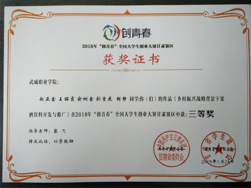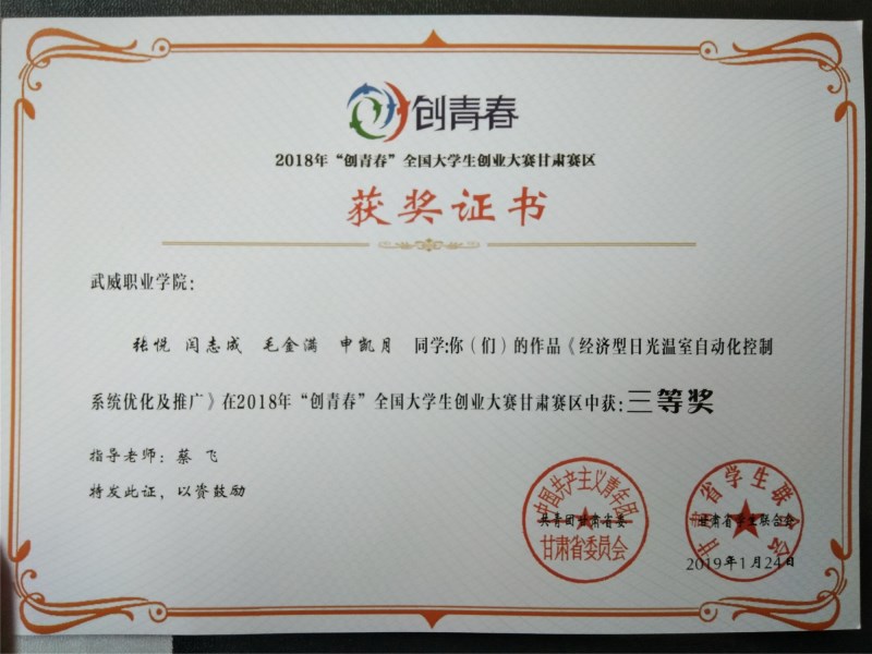 現(xiàn)代農(nóng)業(yè)技術(shù)系兩件作品獲得2018年“創(chuàng)青春”全國(guó)大學(xué)生創(chuàng)業(yè)大賽甘肅賽區(qū)三等獎(jiǎng)