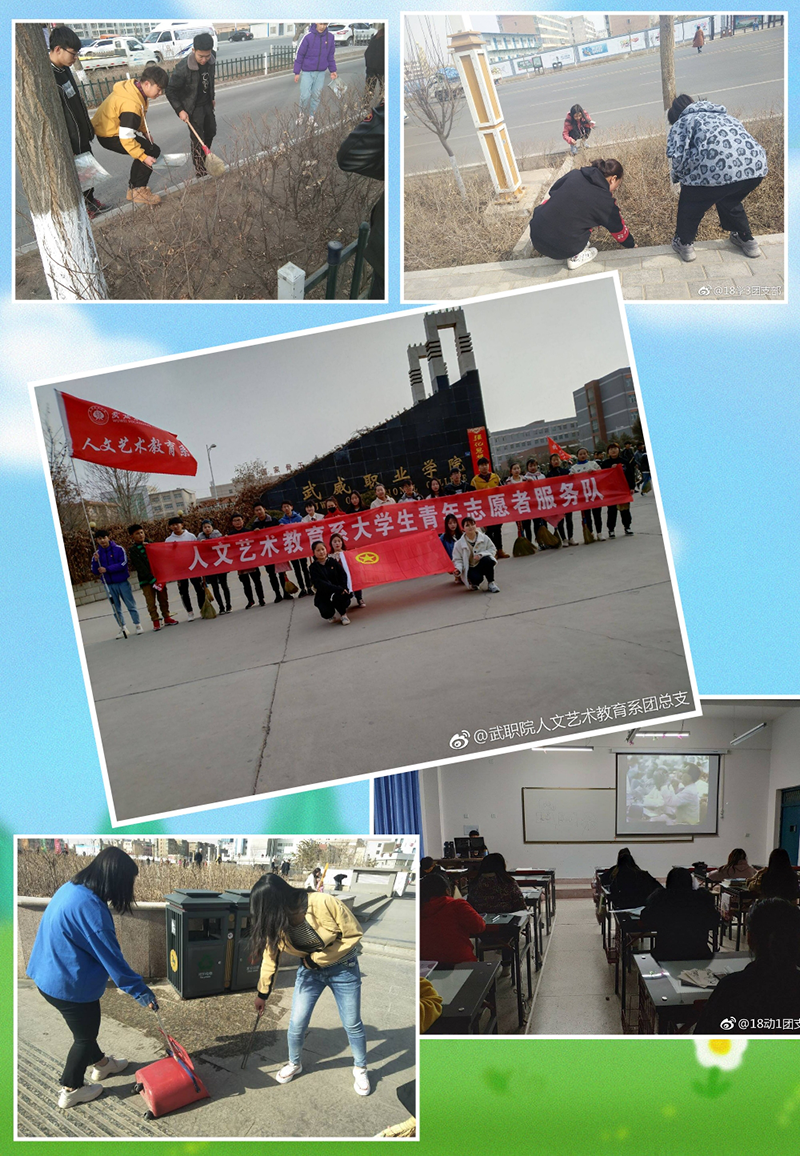 活動開始階段,我系組織各班觀看《向雷鋒同志學(xué)習(xí)》的紀錄片,同時開展“環(huán)境保護從我做起”校園服務(wù)活動,3月9日由系輔導(dǎo)員齊斌文老師帶領(lǐng)志愿者們到武威市文化廣場開展清潔志愿活動;3月17日由唐鑫基老師帶隊前往涼州區(qū)高壩敬老院開展志愿服務(wù)活動;3月29日由馮燕老師帶隊前往雷臺公園開展志愿服務(wù)。
