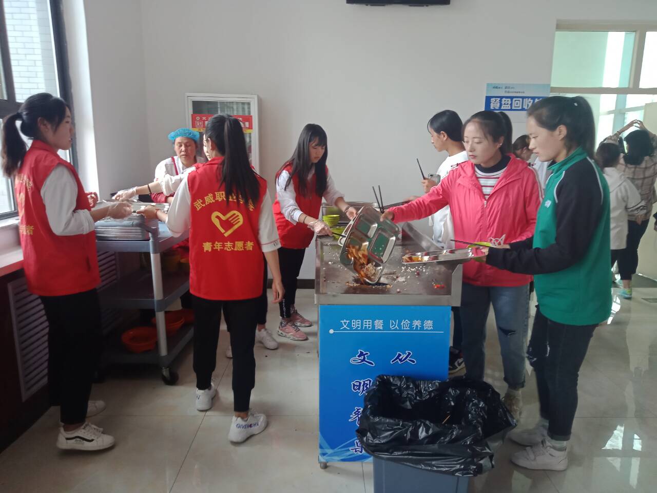 為了規(guī)范學(xué)生用餐禮儀,培養(yǎng)良好的用餐習(xí)慣,人文藝術(shù)教育系志愿者于5月31日在一號(hào)食堂和二號(hào)食堂分別進(jìn)行了“自覺(jué)回收餐盤,文明用餐”的志愿服務(wù)活動(dòng),在負(fù)責(zé)人的組織下同學(xué)們禮貌待人,溫馨提示同學(xué)們回收餐盤,于己方便,更是與人方便。