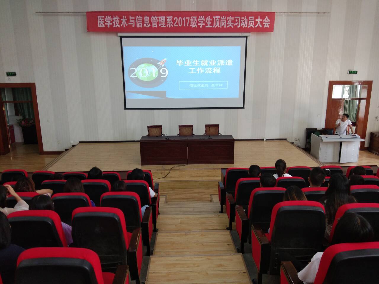 為了進一步做好2017級學生實習工作,拓寬同學們畢業(yè)后就業(yè)渠道,7月2日,醫(yī)學技術(shù)學院在尚德樓正德廳召開了2017級學生頂崗實習動員暨就業(yè)指導會議,參加本次會議的有蔡濟眾副主任、17級全體班主任及17級全體學生。會議由系部招生就業(yè)工作負責人李培良主持。