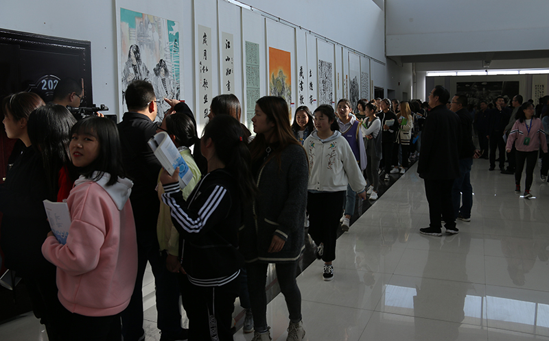 趙明宣布“不忘初心,牢記使命”武威美術(shù)書法作品交流展開幕。隨后,學(xué)院師生觀看欣賞了展覽作品。
