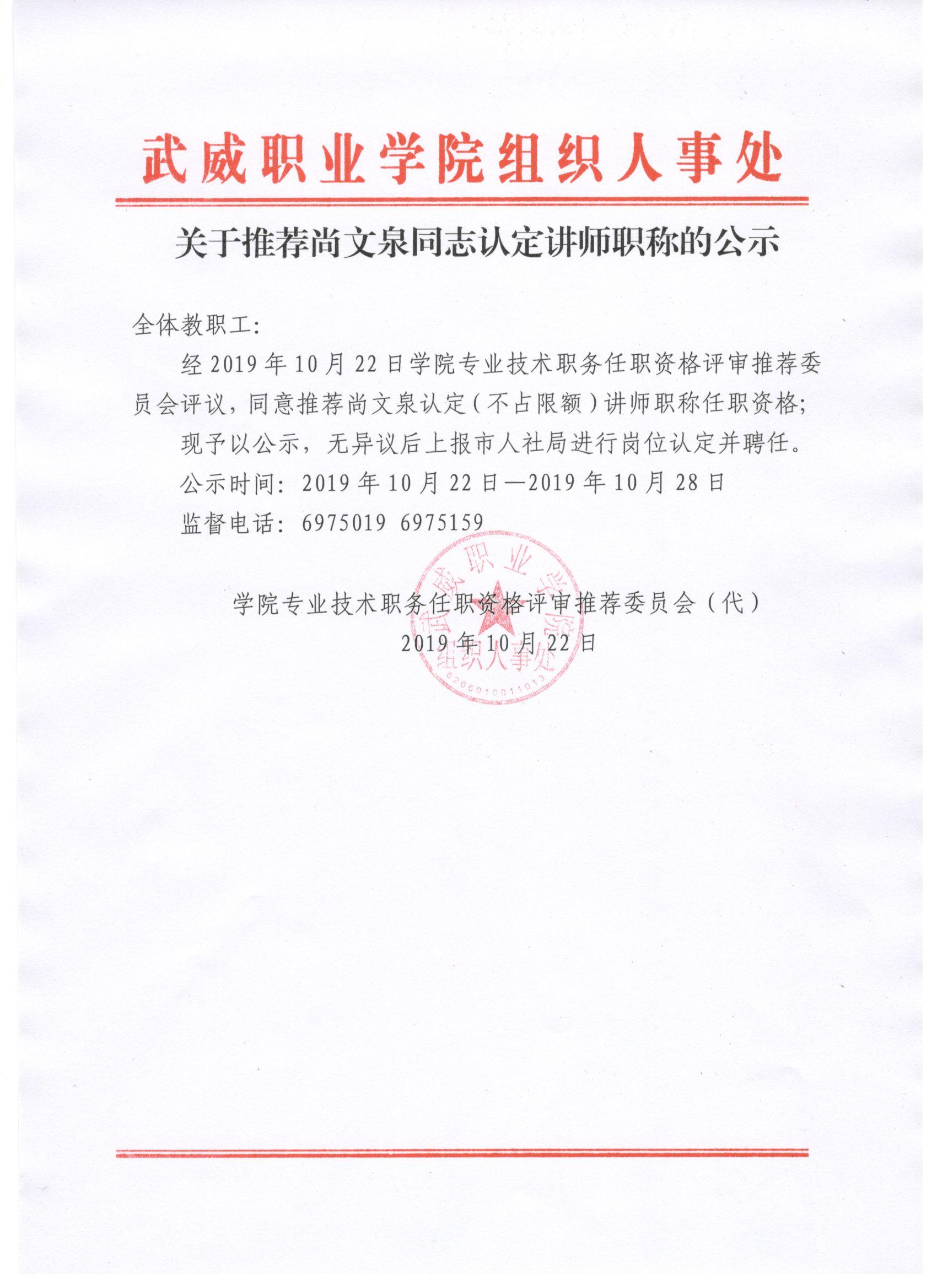 關(guān)于推薦尚文泉同志認(rèn)定講師職稱(chēng)的公示