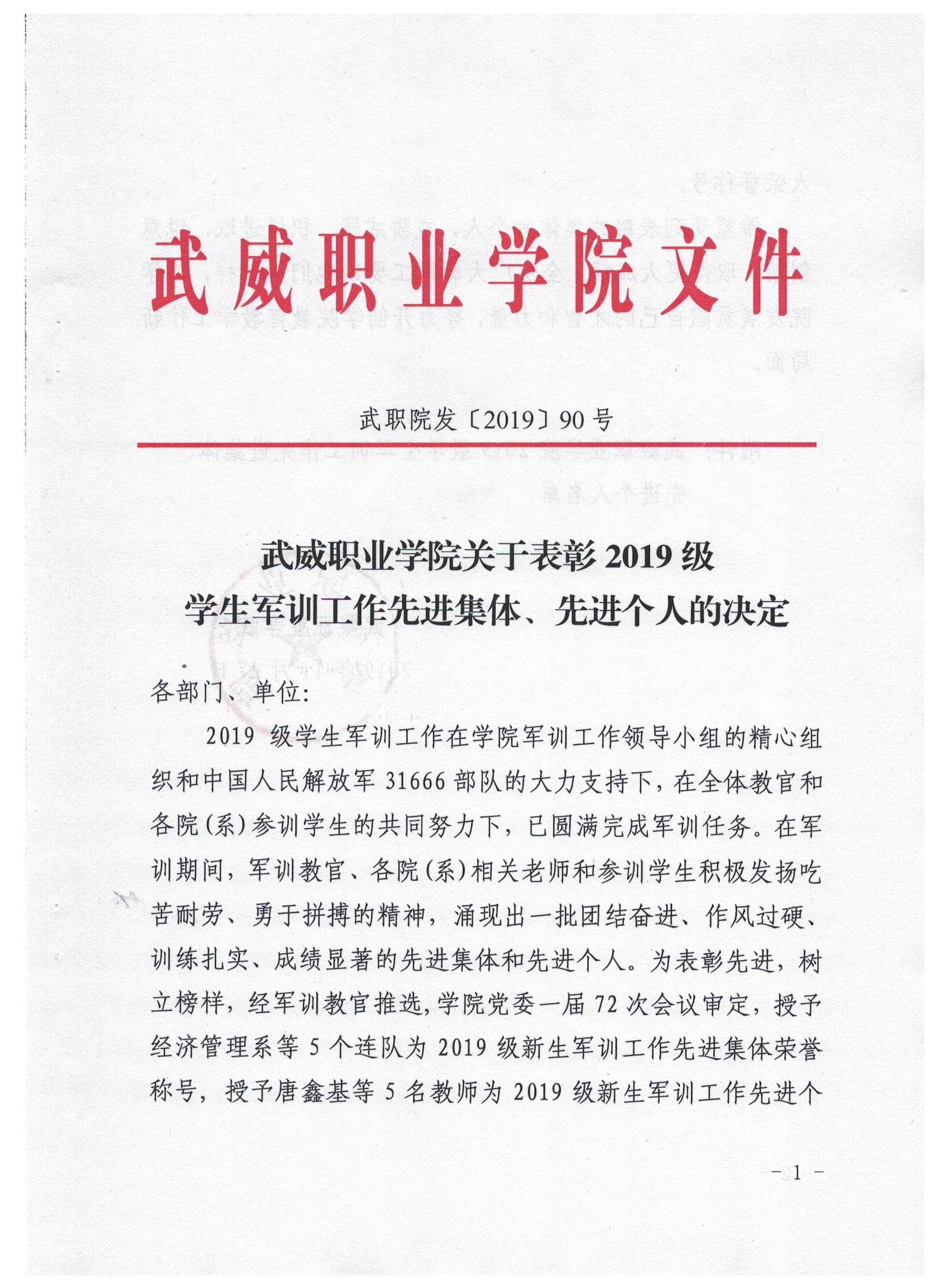 武威職業(yè)學(xué)院關(guān)于表彰2019級(jí)學(xué)生軍訓(xùn)工作先進(jìn)集體、先進(jìn)個(gè)人的決定