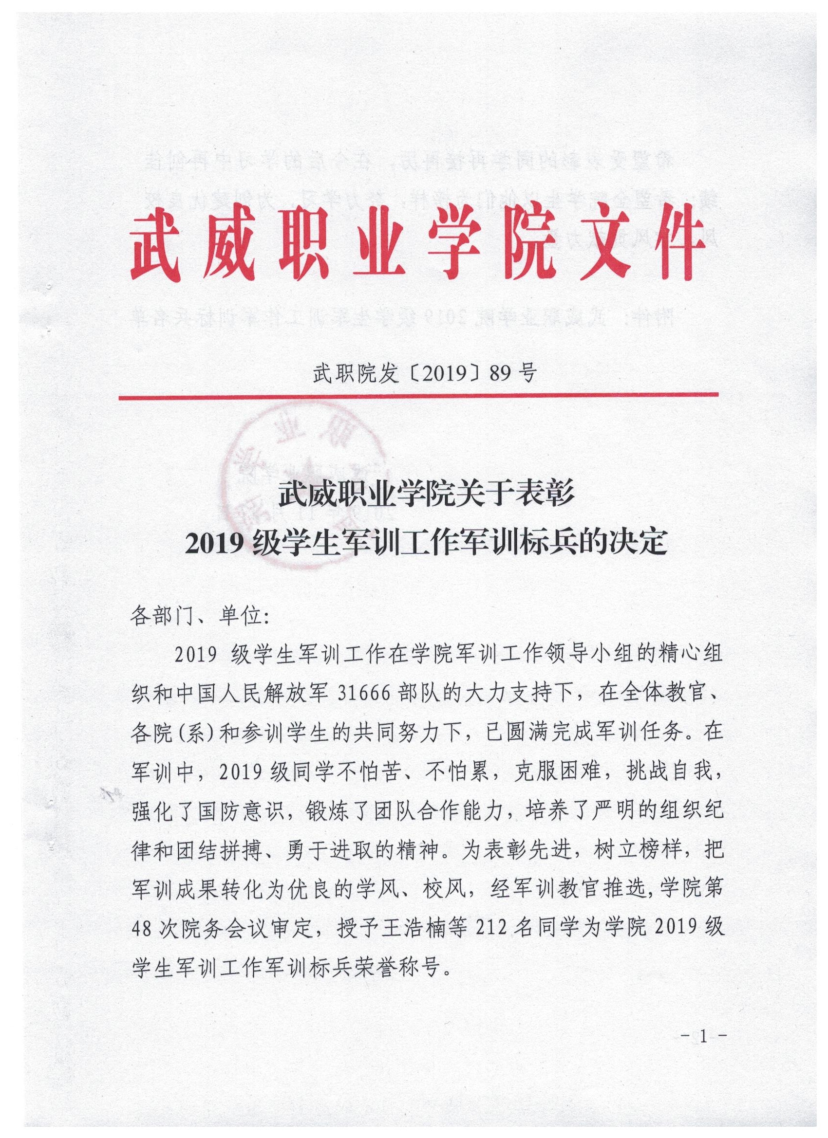 武威職業(yè)學院關于表彰2019級學生軍訓工作軍訓標兵的決定