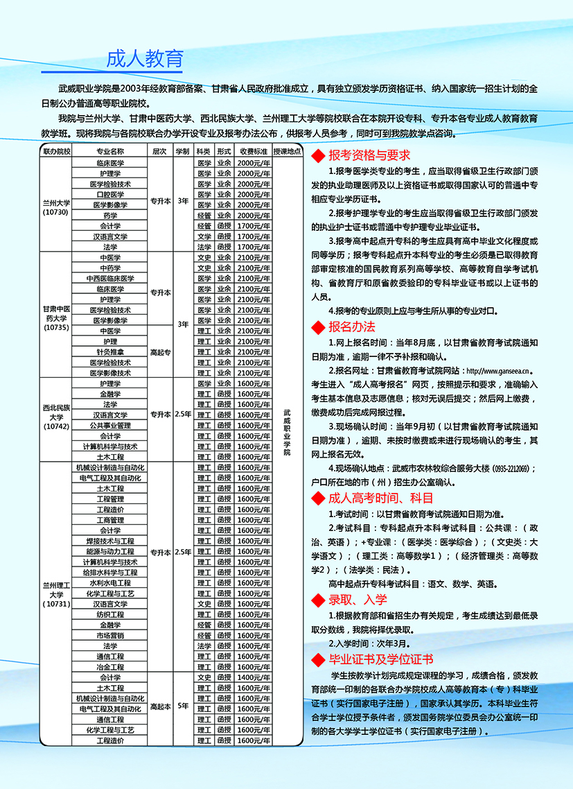 武威職業(yè)學(xué)院繼續(xù)教育學(xué)院2019年招生簡章