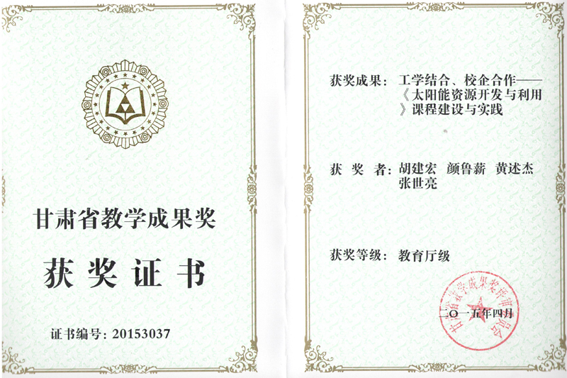 甘肅省教學(xué)成果獎:工學(xué)結(jié)合、校企合作——《太陽能資源開發(fā)與利用》課程建設(shè)與實踐