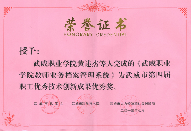 武威市第四屆職工優(yōu)秀技術(shù)創(chuàng)新成果優(yōu)秀獎(jiǎng)