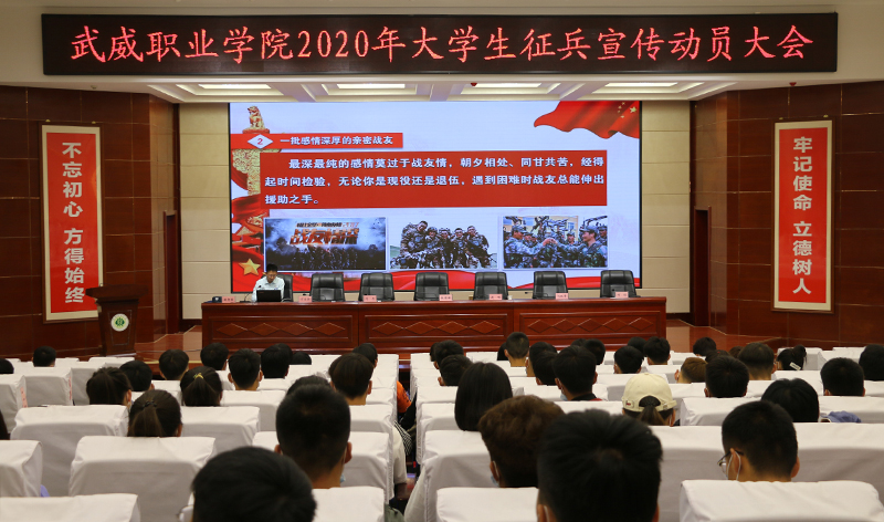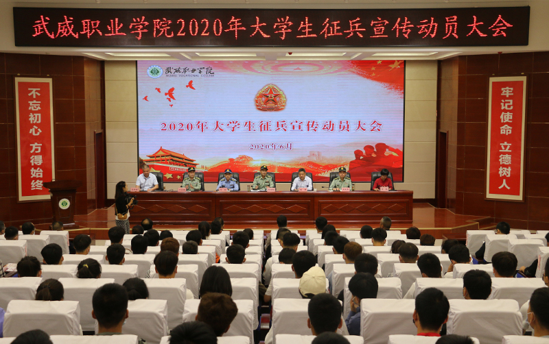6月10日上午,學(xué)院2020年大學(xué)生征兵宣傳動員大會在菁英廳舉行。武威軍分區(qū)司令員張國輝、武威軍分區(qū)動員處處長劉忠、涼州區(qū)人武部部長闞延貴、涼州區(qū)人武部政委丁俊強,學(xué)院黨委書記、院長趙明,副院長何毅出席會議。各院系負責人、輔導(dǎo)員和學(xué)生代表共200人參加了會議。會議由副院長王守云主持。