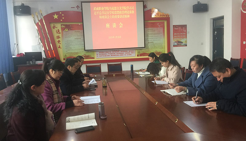 為了深入學(xué)習(xí)貫徹習(xí)近平總書記在在學(xué)校思想政治理論課教師座談會(huì)上的講話精神,3月20日下午,武威職業(yè)學(xué)院馬克思主義學(xué)院召開思政教師座談會(huì),專題學(xué)習(xí)習(xí)近平總書記在學(xué)校思想政治理論課教師座談會(huì)上的重要講話精神,深入交流學(xué)習(xí)總書記講話精神的心得體會(huì)。會(huì)議由馬克思主義學(xué)院副院長胡靜峰主持。