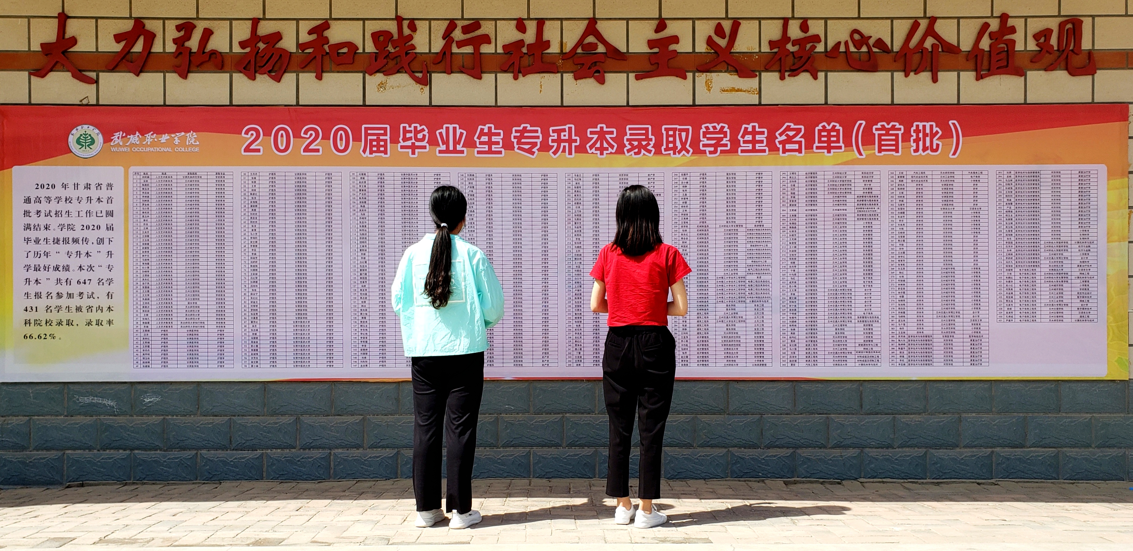 2020年甘肅省普通高等學(xué)校專(zhuān)升本首次考試招生工作已圓滿結(jié)束。學(xué)院2020屆畢業(yè)生捷報(bào)頻傳,創(chuàng)下了歷年“專(zhuān)升本”升學(xué)的最好成績(jī)。本次“專(zhuān)升本”共有647名學(xué)生報(bào)名參加考試,有431名學(xué)生被省內(nèi)本科院校錄取,錄取率為66.62%。