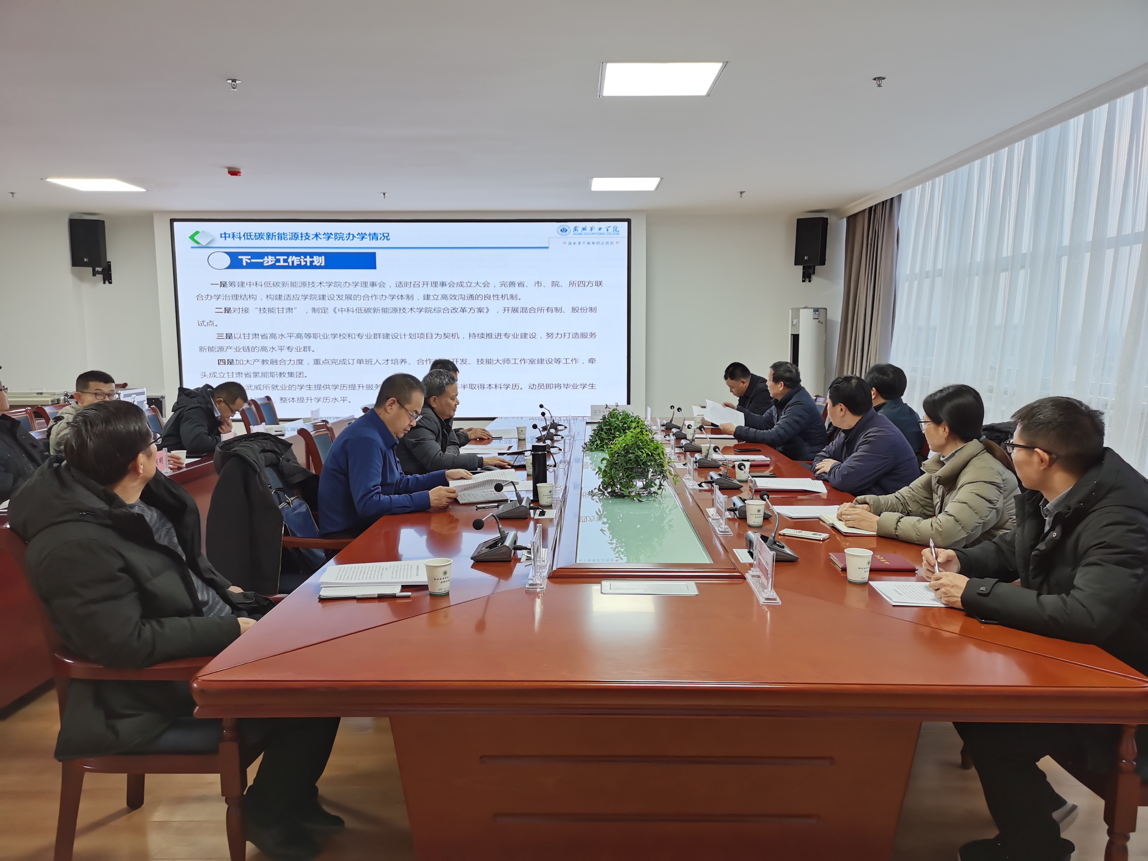 參觀結(jié)束后,學(xué)院在能源科技樓811會議召開了中科低碳新能源技術(shù)學(xué)院工作座談會。會上,趙明介紹了學(xué)院整合教學(xué)資源建設(shè)發(fā)展歷程、黨的建設(shè)、優(yōu)質(zhì)校建設(shè)、專業(yè)建設(shè)、合作辦學(xué)、師資隊(duì)伍建設(shè)、招生就業(yè)、科研服務(wù)、對外交流、校企合作和“雙高”院校創(chuàng)建等情況。重點(diǎn)就中科低碳新能源技術(shù)學(xué)院建設(shè)發(fā)展、專業(yè)申報(bào)、實(shí)驗(yàn)實(shí)訓(xùn)室建設(shè)、教育教學(xué)、人才培養(yǎng)和下一步工作計(jì)劃等情況進(jìn)行了詳細(xì)介紹。