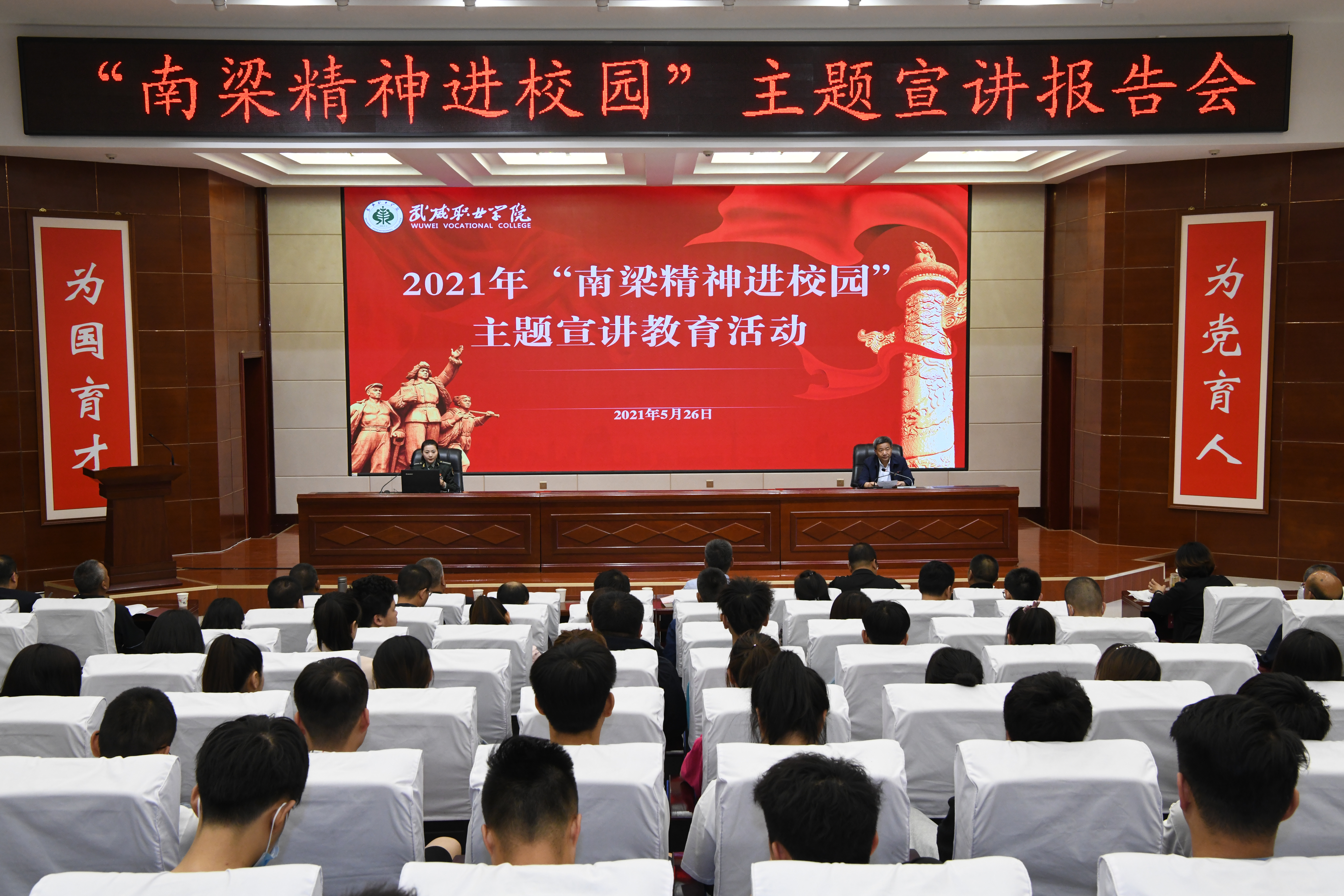 為深入學(xué)習(xí)貫徹習(xí)近平總書記視察甘肅重要講話和指示精神,持續(xù)推進紅色基因傳承行動,進一步傳承和弘揚南梁精神,推進南梁精神進校園、進課堂、進師生頭腦,根據(jù)中共甘肅省委教育工作委員會通知要求,結(jié)合學(xué)院黨史學(xué)習(xí)教育實際,5月26日,2021年“南梁精神進校園”主題宣講教育活動在武威職業(yè)學(xué)院舉辦,宣講教育活動分為場內(nèi)場外兩個場地兩種形式同時進行。