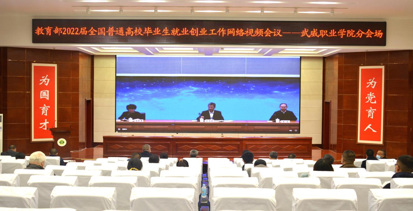 11月19日下午,教育部、人力資源社會保障部召開2022屆普通高校畢業(yè)生就業(yè)視頻會議。教育部黨組書記、部長懷進鵬,人力資源社會保障部黨組成員、副部長李忠出席會議并講話,教育部黨組成員、副部長翁鐵慧主持會議。我院設立武威職業(yè)學院分會場,學院黨委書記、院長趙明,副院長王守云,招就處、雙創(chuàng)中心、學工處相關負責同志,各教學院系黨總支書記、主任、就業(yè)工作輔導員及畢業(yè)班班主任共計86人,在學院學生發(fā)展中心菁英廳集中參加網(wǎng)絡視頻會議。