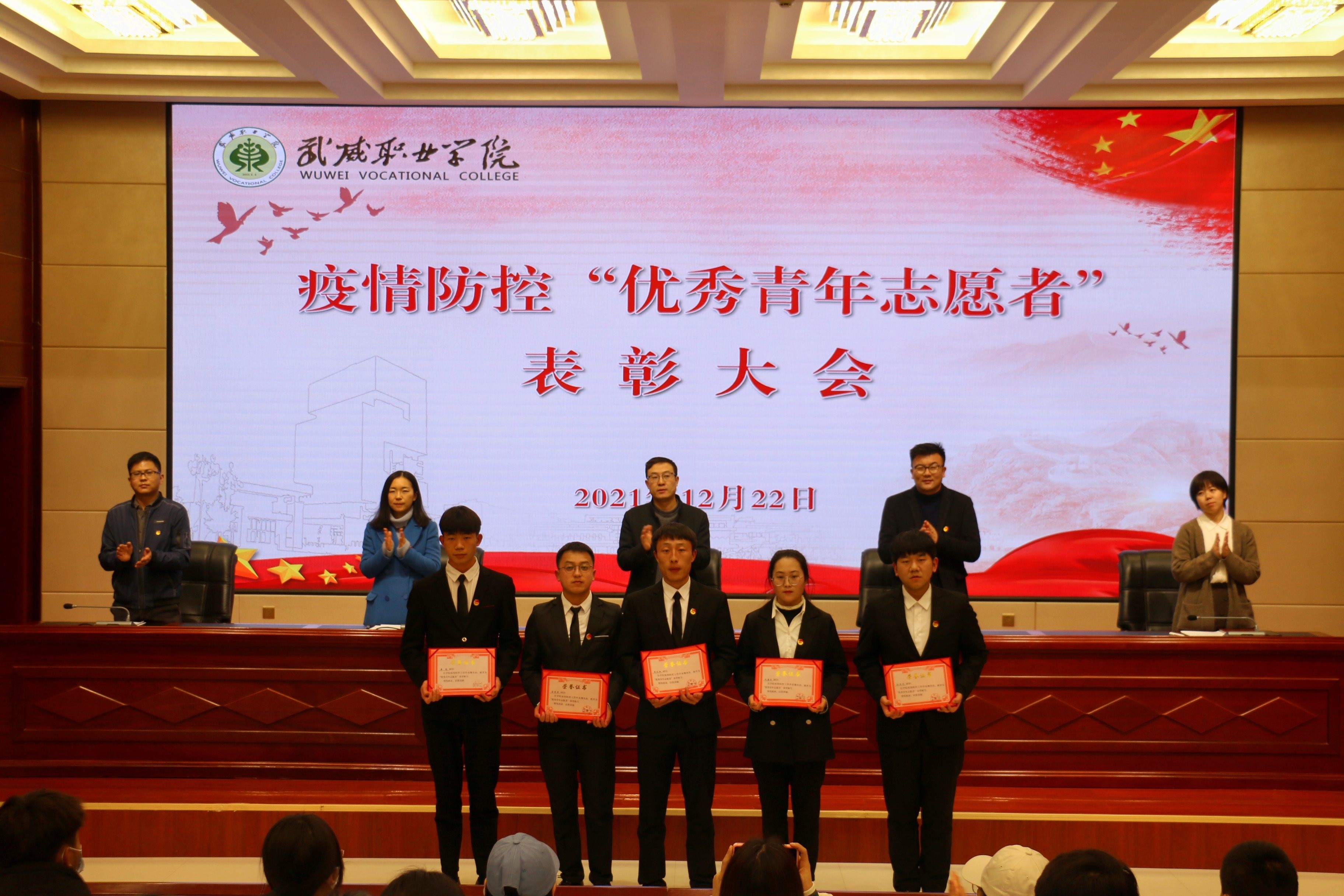 在表彰大會上,宣讀了《武威職業(yè)學院關于對疫情防控期間優(yōu)秀青年志愿者進行通報表揚的決定》,為疫情防控期間優(yōu)秀青年志愿者代表頒發(fā)了榮譽證書。