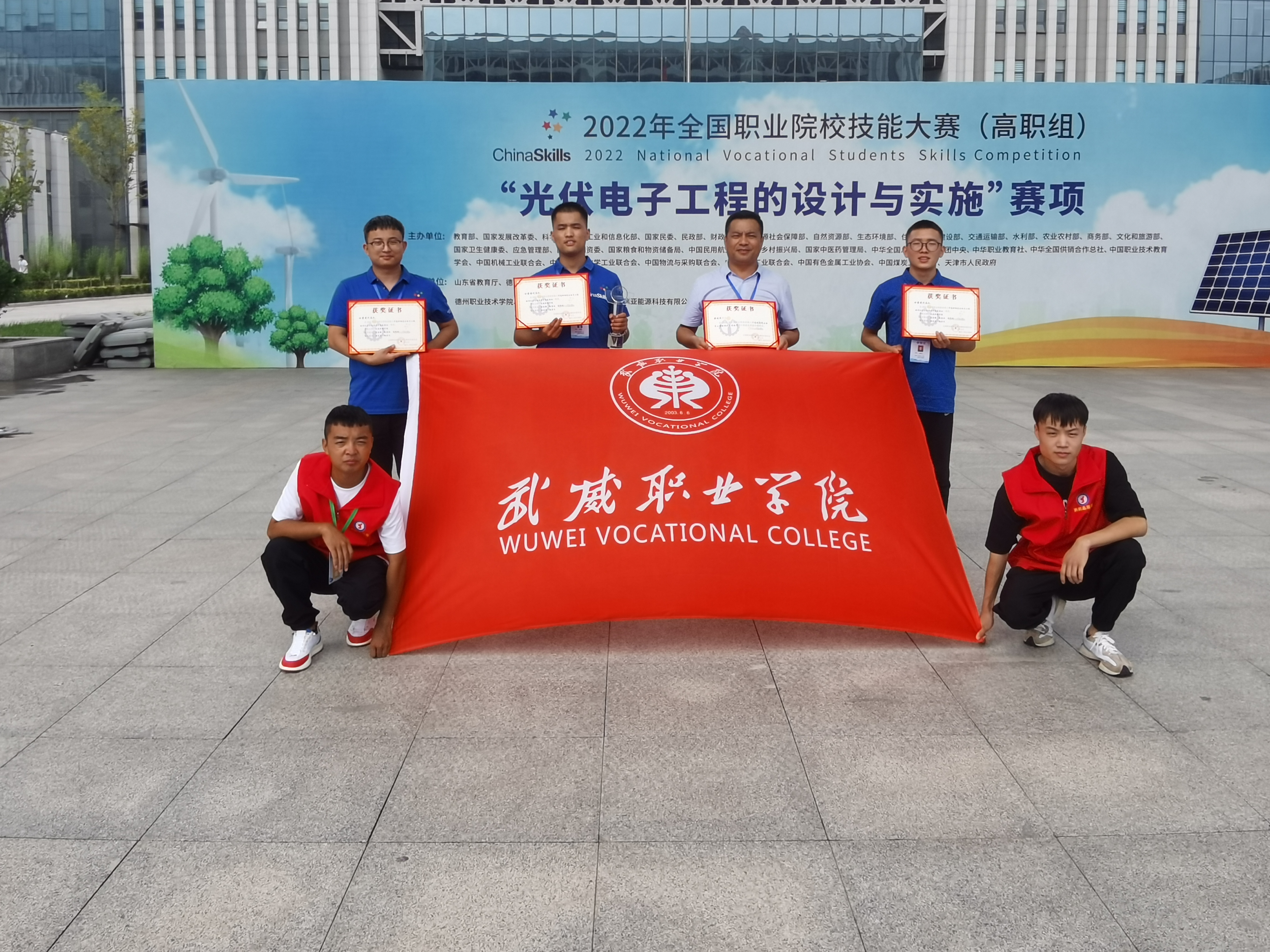 8月22日至23日,由教育部、工業(yè)和信息化部、財政部、人力資源和社會保障部、住房和城鄉(xiāng)建設(shè)部、交通運輸部、農(nóng)業(yè)部等部委主辦的2022年全國職業(yè)院校技能大賽高職組“光伏電子工程的設(shè)計與實施”賽項在山東德州職業(yè)技術(shù)學(xué)院舉辦,來自全國30個省(市)、自治區(qū)的55支代表隊參加了比賽。武威職業(yè)學(xué)院中科低碳新能源技術(shù)學(xué)院高東興、富金強、趙寶林三名同學(xué)代表甘肅省參加本次大賽,最終榮獲國賽一等獎,完全實現(xiàn)了賽前確定的“穩(wěn)二爭一”的目標任務(wù)。這是學(xué)校參加全國職業(yè)院校技能大賽以來首次獲得國賽一等獎,實現(xiàn)了學(xué)校該賽項國獎“零”的突破,開啟了學(xué)校專業(yè)建設(shè)高質(zhì)量發(fā)展新征程。本次優(yōu)異成績的取得充分展現(xiàn)了學(xué)校“崗課賽證”相融通的綜合育人效果,充分體現(xiàn)了學(xué)校深化“三教改革”推動高質(zhì)量發(fā)展的成效,充分彰顯了學(xué)校實施“雙高計劃”“技能甘肅”“提質(zhì)培優(yōu)”等重大項目建設(shè)推進高水平發(fā)展的成效,本次競賽成績是對學(xué)校新能源類專業(yè)建設(shè)的肯定,也是武威乃至全省職業(yè)教育發(fā)展的試金石和榮光。