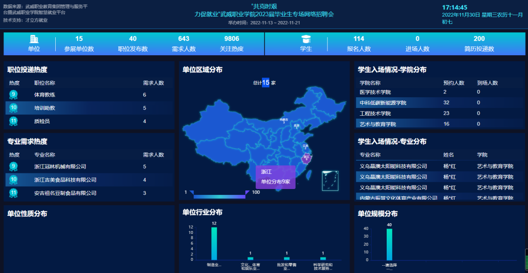 本次云聘系列活動分兩個階段舉行,第一階段為“共克時艱力促就業(yè)”武威職業(yè)學院2023屆畢業(yè)生專場網絡招聘會,于11月7日至11月21日舉行。本次招聘會主要面向在疫情條件下,能夠專車接運學生赴企業(yè)就業(yè)的單位。湖州市安吉縣人力資源和社會保障局組織10余家當?shù)仄髽I(yè)參加了本次招聘會,同時吸引內蒙古靈圣作物科技有限公司、江蘇京東信息技術有限公司、義烏晶澳太陽能科技有限公司、內蒙古振慧文化體育產業(yè)有限公司等企業(yè)參加,提供招聘職位40個,需求人數(shù)643人,招聘會關注人次達9806,200余人投遞簡歷。