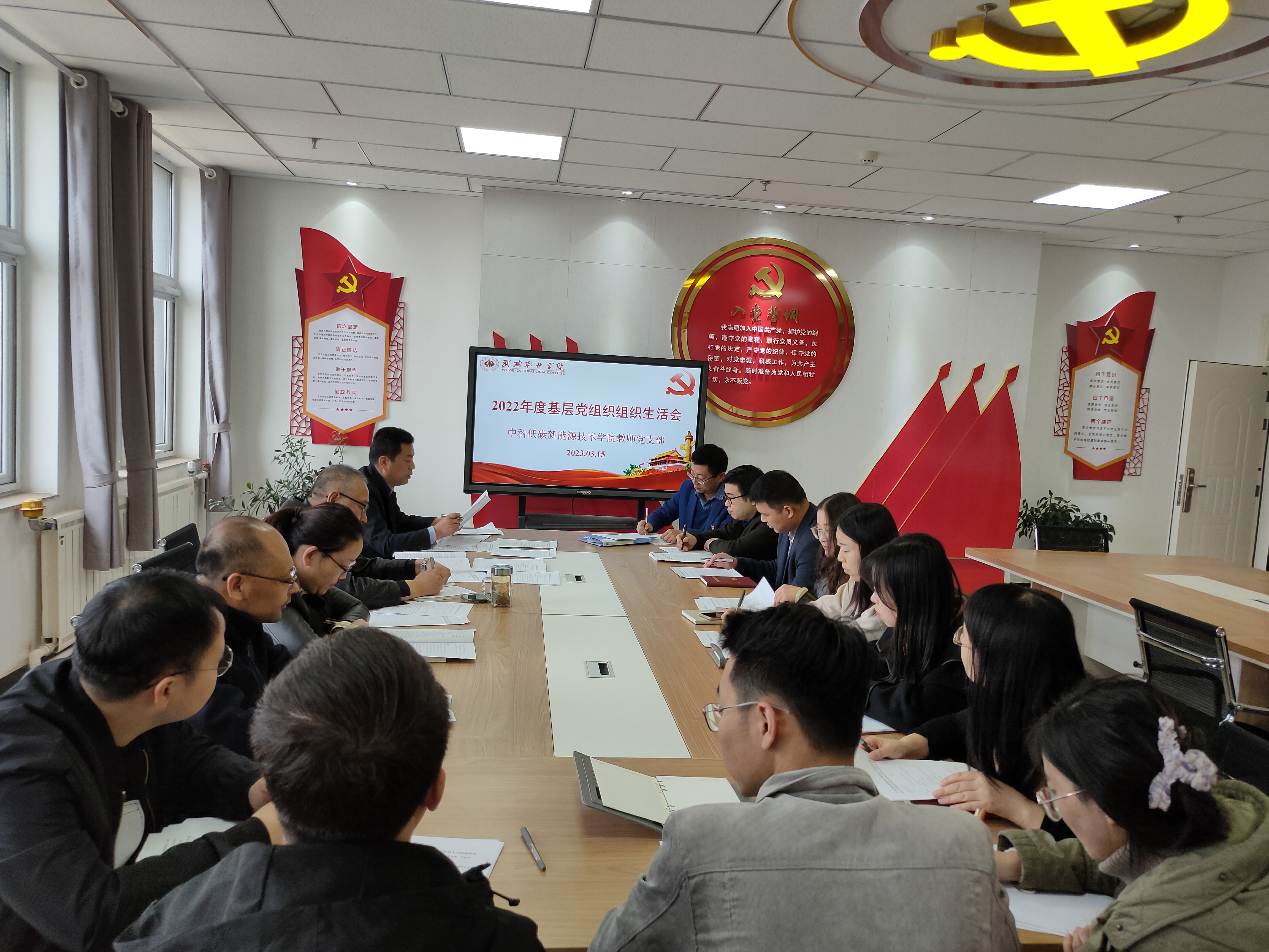 為深入學(xué)習(xí)貫徹黨的二十大精神,堅(jiān)持不懈用習(xí)近平新時(shí)代中國(guó)特色社會(huì)主義思想凝心鑄魂,不斷提升基層黨組織政治功能和組織力,進(jìn)一步激發(fā)黨員充分發(fā)揮先鋒模范作用,按照校黨委統(tǒng)一部署,3月15日下午,中科低碳新能源技術(shù)學(xué)院教師黨支部、學(xué)生黨支部在能源科技樓610、604召開(kāi)2022年度基層黨組織組織生活會(huì)和開(kāi)展民主評(píng)議黨員活動(dòng)。會(huì)議由兩個(gè)支部書(shū)記主持,支部全體黨員參加,學(xué)校第二督導(dǎo)組成員張世亮、許中璞全程參與督導(dǎo)。