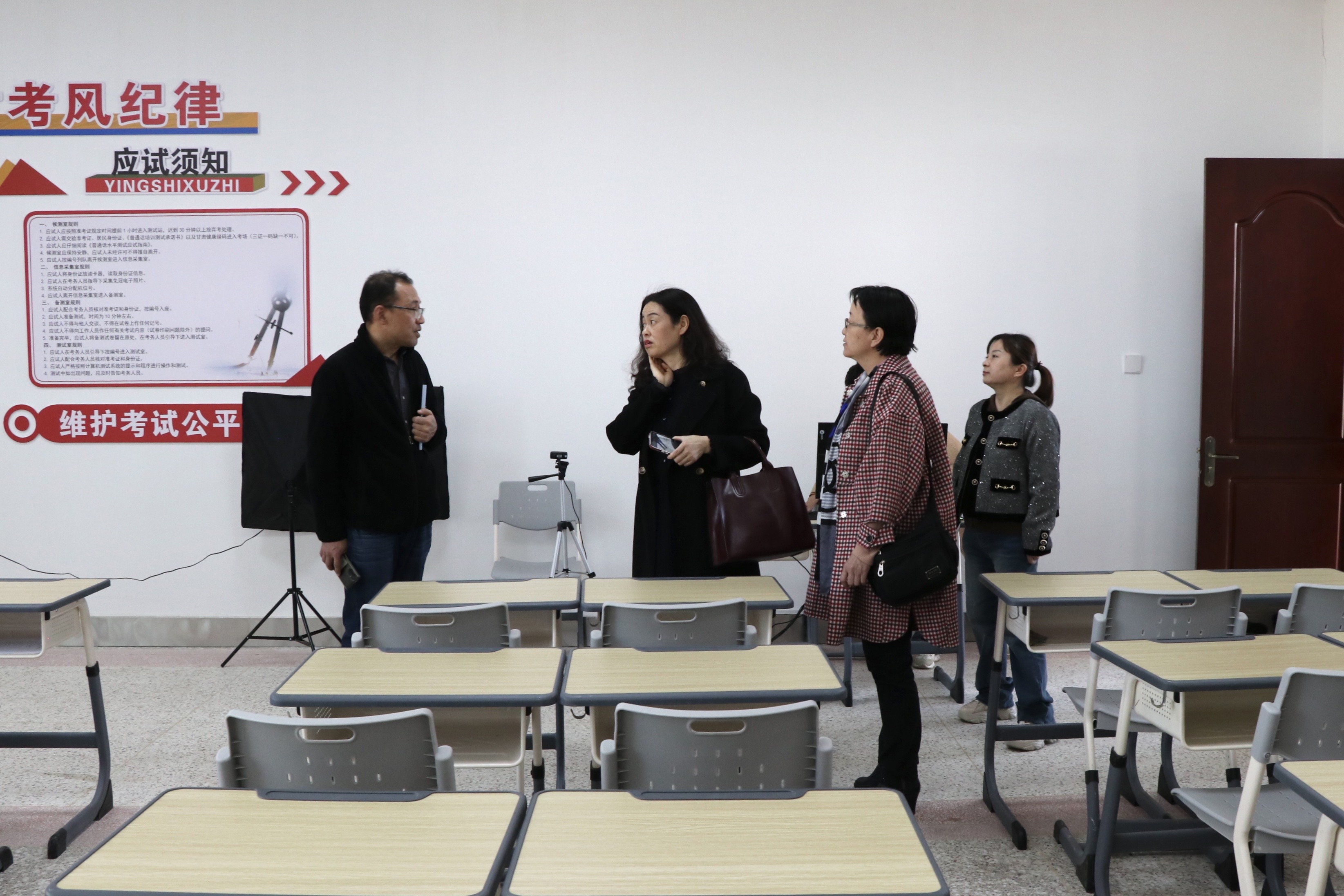 評估驗收組采取實地查看、聽取匯報、座談交流等方式對我校測試站的標(biāo)準(zhǔn)化建設(shè)工作進(jìn)行了檢查。新建的普通話標(biāo)準(zhǔn)化測試機(jī)房配備20個機(jī)位,空間場地充足,面積規(guī)模較大;同時建成了候測室、信息采集室,布局科學(xué)合理,設(shè)備配置齊全;制作了語言文字宣傳欄、“推普”展板、標(biāo)志牌、指引牌等,為普通話測試營造了良好的考試環(huán)境。