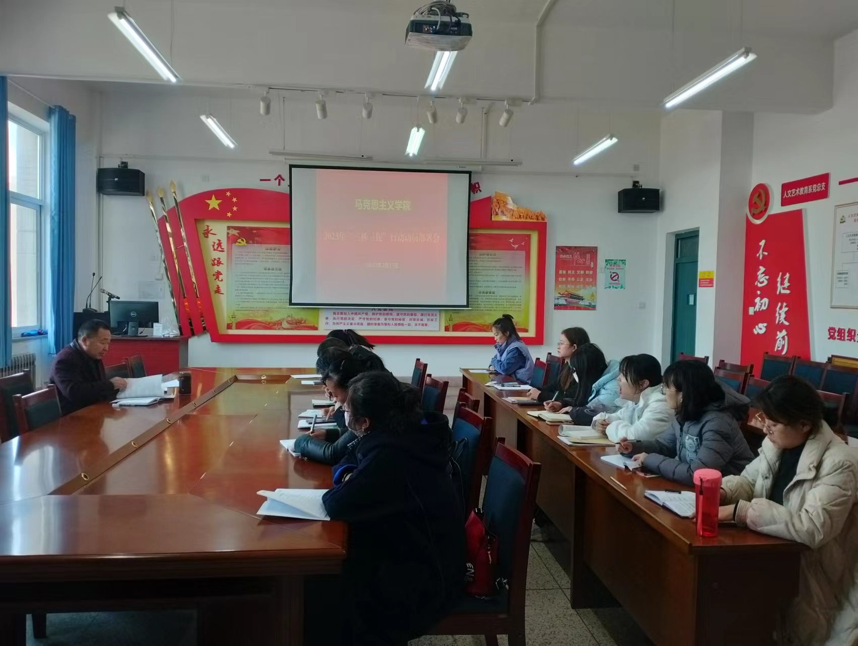 近日,按照學(xué)?!叭ト佟毙袆觿訂T部署會要求,馬克思主義學(xué)院第一時間召開會議,統(tǒng)一思想,明確任務(wù),召開“三抓三促”行動動員部署會,學(xué)院負(fù)責(zé)人劉心主持會議,全體思政課教師參加了會議。