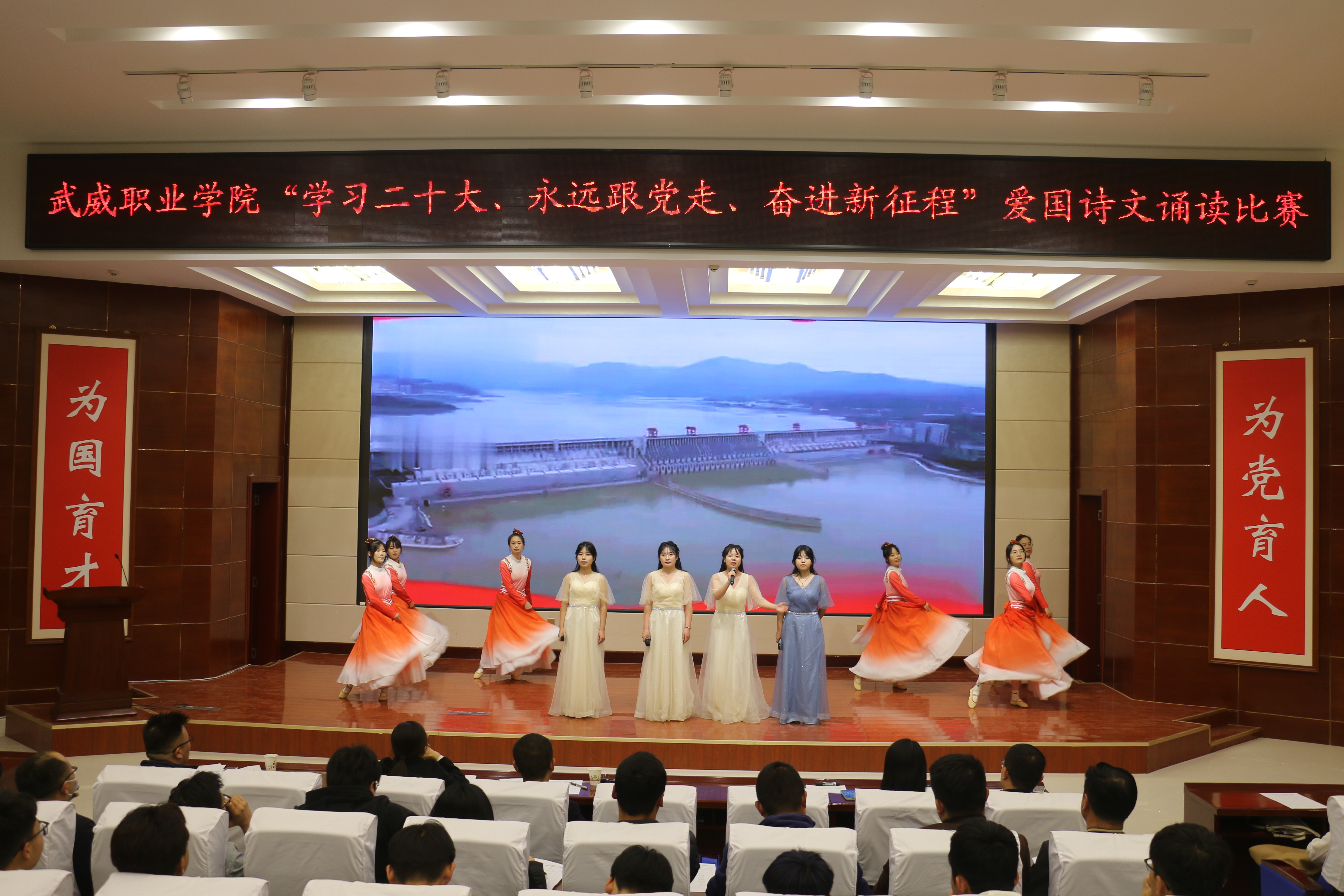 大賽于3月啟動,歷時一個月,各二級學院經(jīng)過初賽評比推選出9個優(yōu)秀節(jié)目入圍決賽。比賽現(xiàn)場,各參賽隊以“學習二十大、永遠跟黨走、奮進新征程”為主題,將傳承經(jīng)典詩文和弘揚愛國主義精神結(jié)合,誦詩抒情、借詞言志,熱情謳歌中國共產(chǎn)黨不懈奮斗的光輝歷程,全面展現(xiàn)新時代青年以夢為馬,不負韶華的青春風貌。校團委原創(chuàng)編排表演的節(jié)目《追夢八步沙,奮斗正青春》,深情動人,感染全場,歌頌了“六老漢”矢志艱苦奮斗的隴人品格,抒發(fā)了當代青年永跟黨走,青春建功的豪情壯志。富余藝術(shù)感染力的經(jīng)典吟誦,穿插舞蹈、劇情和紅歌演唱,為廣大師生呈現(xiàn)了一場視聽盛宴。