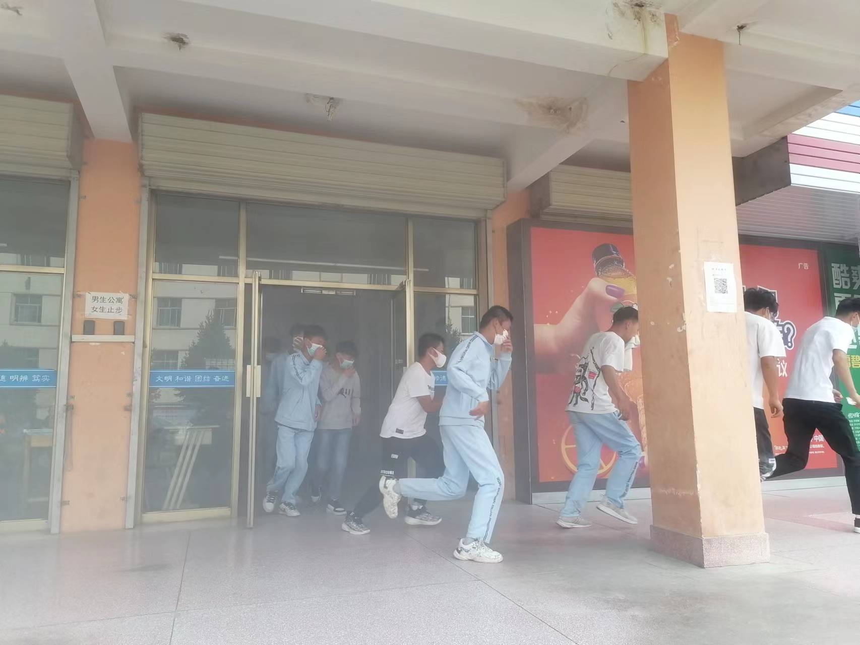 15時20分,疏散演練正式開始。隨著火災(zāi)警報響起,安全保衛(wèi)工作人員點燃煙餅,在學(xué)生公寓樓模擬火災(zāi)現(xiàn)場,冒出滾滾濃煙,公寓管理人員迅速組織學(xué)生有序疏散。在輔導(dǎo)員、班主任的引導(dǎo)下,同學(xué)們按照動作要領(lǐng),用濕毛巾捂住口鼻,俯身彎腰按照安全出口指示牌快速、有序從疏散通道撤離到體育場,整個過程緊張有序,實用性強,達到了預(yù)期效果。