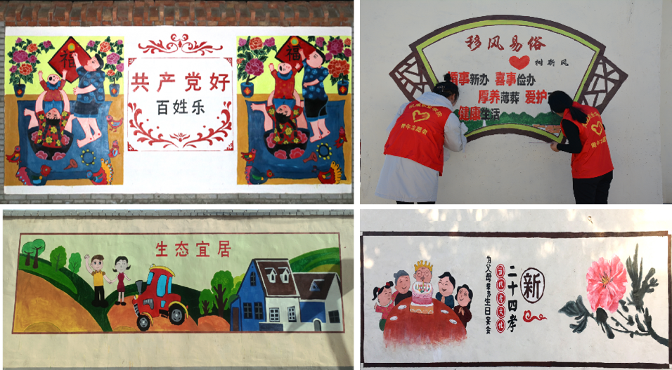 自2019 年以來,學(xué)院堅(jiān)持“立足地方、融入地方、服務(wù)地方”的發(fā)展理念,組織師生開展“打造人文美居助力鄉(xiāng)村振興”墻體彩繪志愿服務(wù)項(xiàng)目,通過墻體彩繪反映黨的領(lǐng)導(dǎo)下農(nóng)村精神風(fēng)貌的變化和取得的成就,將村莊重點(diǎn)街巷屋面墻體繪制出一幅幅反映美麗鄉(xiāng)村建設(shè)、社會主義核心價值觀、移風(fēng)易俗、鄉(xiāng)風(fēng)文明等為主題的墻體畫,形象生動、展現(xiàn)了農(nóng)村新生活、農(nóng)業(yè)新氣象、農(nóng)民新面貌,美化了村容村貌,為美麗鄉(xiāng)村建設(shè)、人居環(huán)境美化添磚加瓦。
