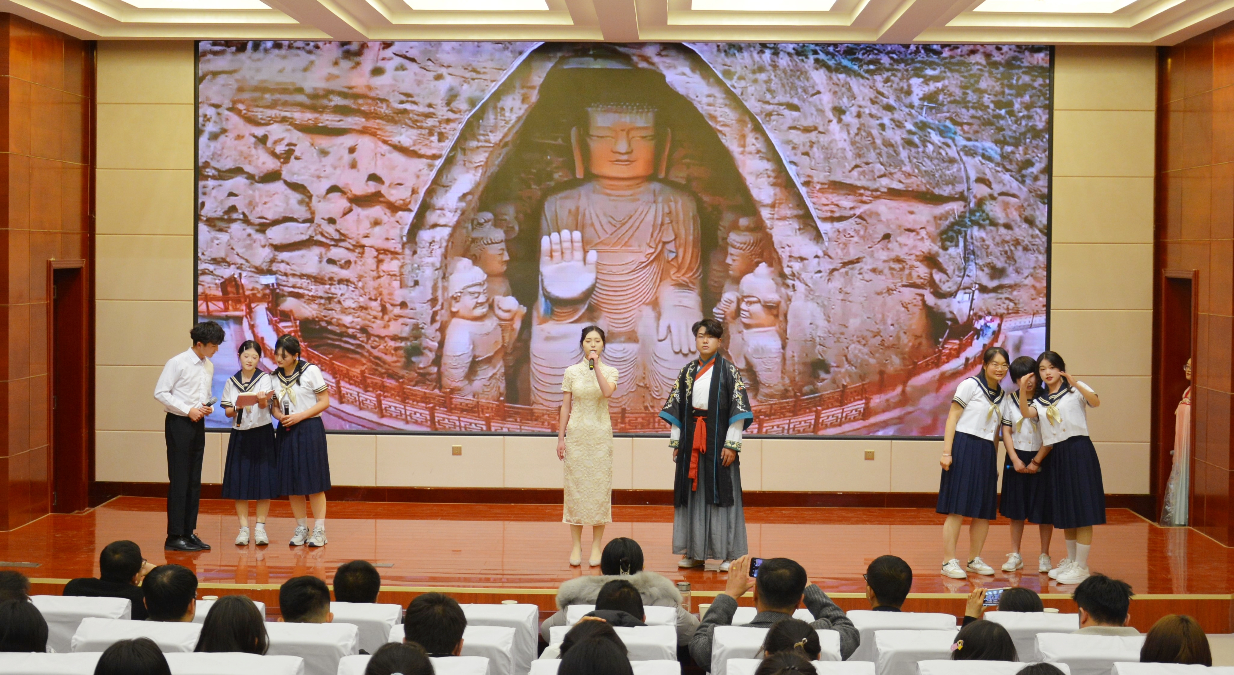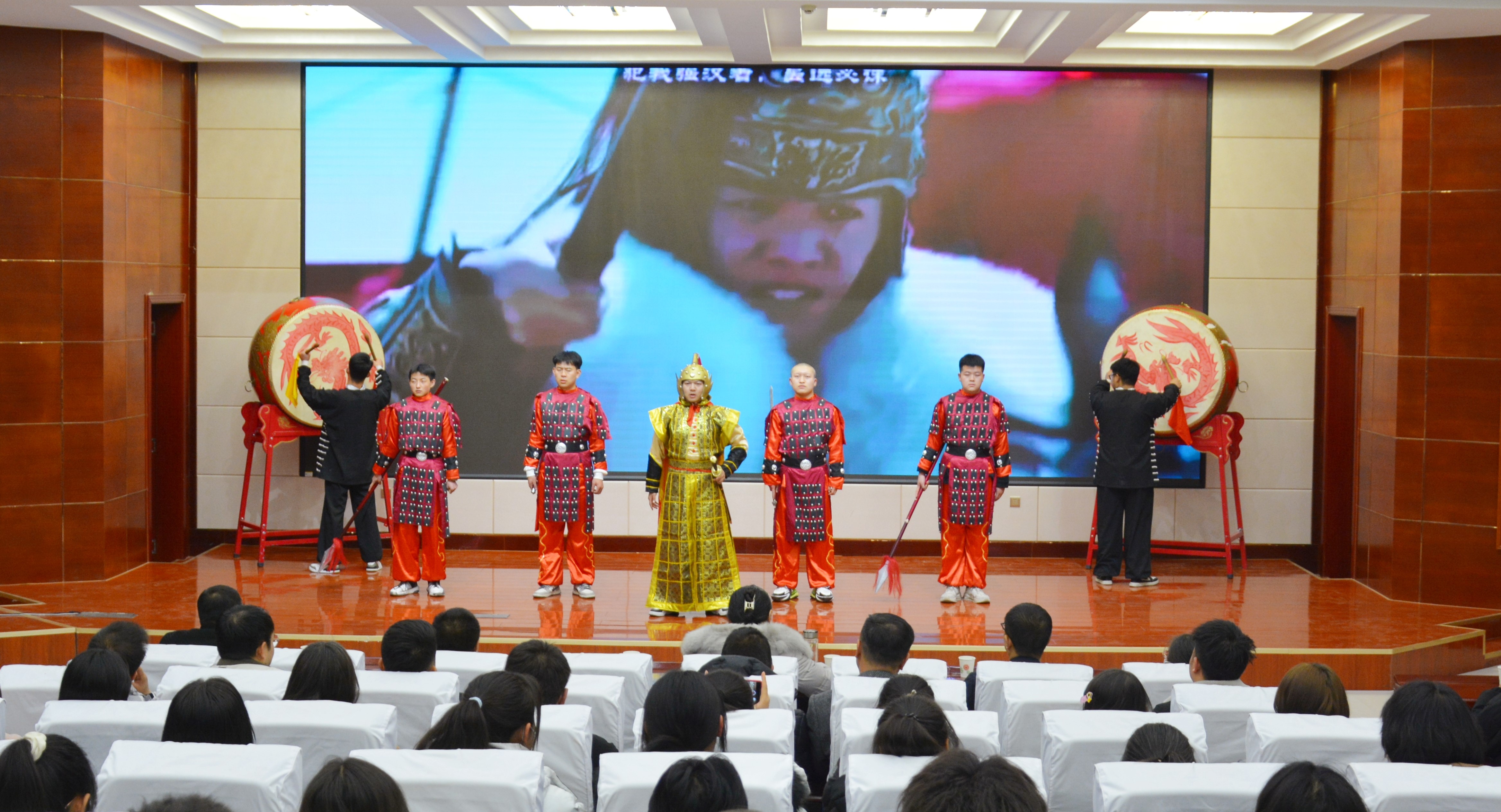 比賽現(xiàn)場(chǎng)精彩紛呈,現(xiàn)場(chǎng)氣氛異常熱烈,掌聲此起彼伏。節(jié)目以詩(shī)歌吟誦、伴舞、書法、國(guó)畫、武術(shù)、情景表演等豐富多彩的藝術(shù)形式,為現(xiàn)場(chǎng)觀眾打造出一場(chǎng)別開生面的涼州文化視聽盛宴。同學(xué)們激情洋溢,用澎湃真摯的情感演繹著經(jīng)典燦爛的磅礴詩(shī)篇,用跨越千年的對(duì)話勾勒出雄渾壯烈的漢武雄風(fēng),用鏗鏘有力的旋律編織出蕩氣回腸的時(shí)代頌歌,以青春奮斗的初心賡續(xù)著生生不息的五涼文化。