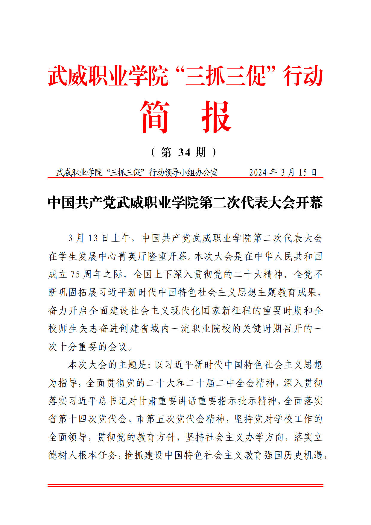 簡(jiǎn)報(bào)第34期:中國(guó)共產(chǎn)黨武威職業(yè)學(xué)院第二次代表大會(huì)開幕