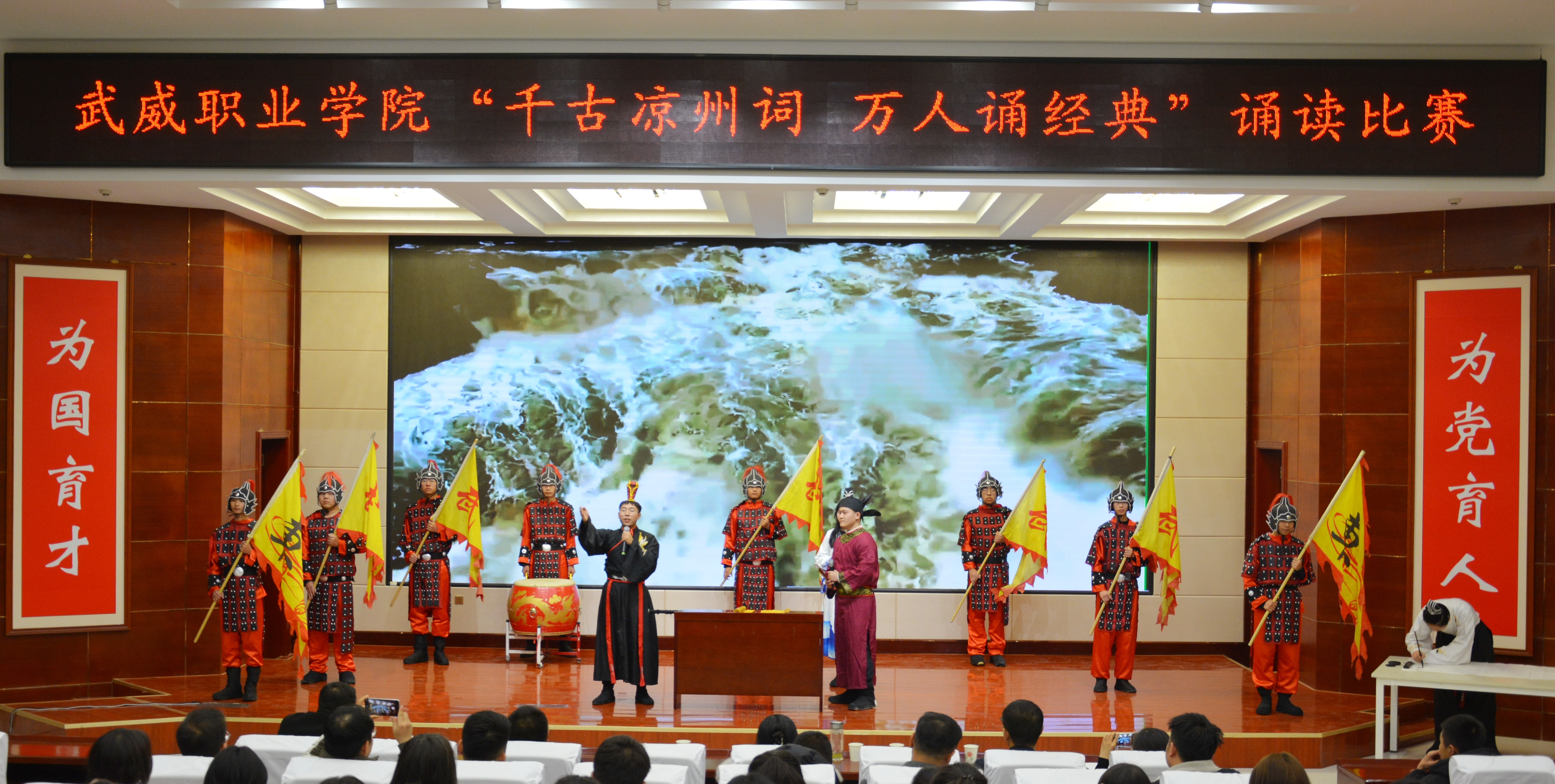 比賽現(xiàn)場(chǎng)精彩紛呈,現(xiàn)場(chǎng)氣氛異常熱烈,掌聲此起彼伏。節(jié)目以詩(shī)歌吟誦、伴舞、書法、國(guó)畫、武術(shù)、情景表演等豐富多彩的藝術(shù)形式,為現(xiàn)場(chǎng)觀眾打造出一場(chǎng)別開生面的涼州文化視聽盛宴。同學(xué)們激情洋溢,用澎湃真摯的情感演繹著經(jīng)典燦爛的磅礴詩(shī)篇,用跨越千年的對(duì)話勾勒出雄渾壯烈的漢武雄風(fēng),用鏗鏘有力的旋律編織出蕩氣回腸的時(shí)代頌歌,以青春奮斗的初心賡續(xù)著生生不息的五涼文化。
