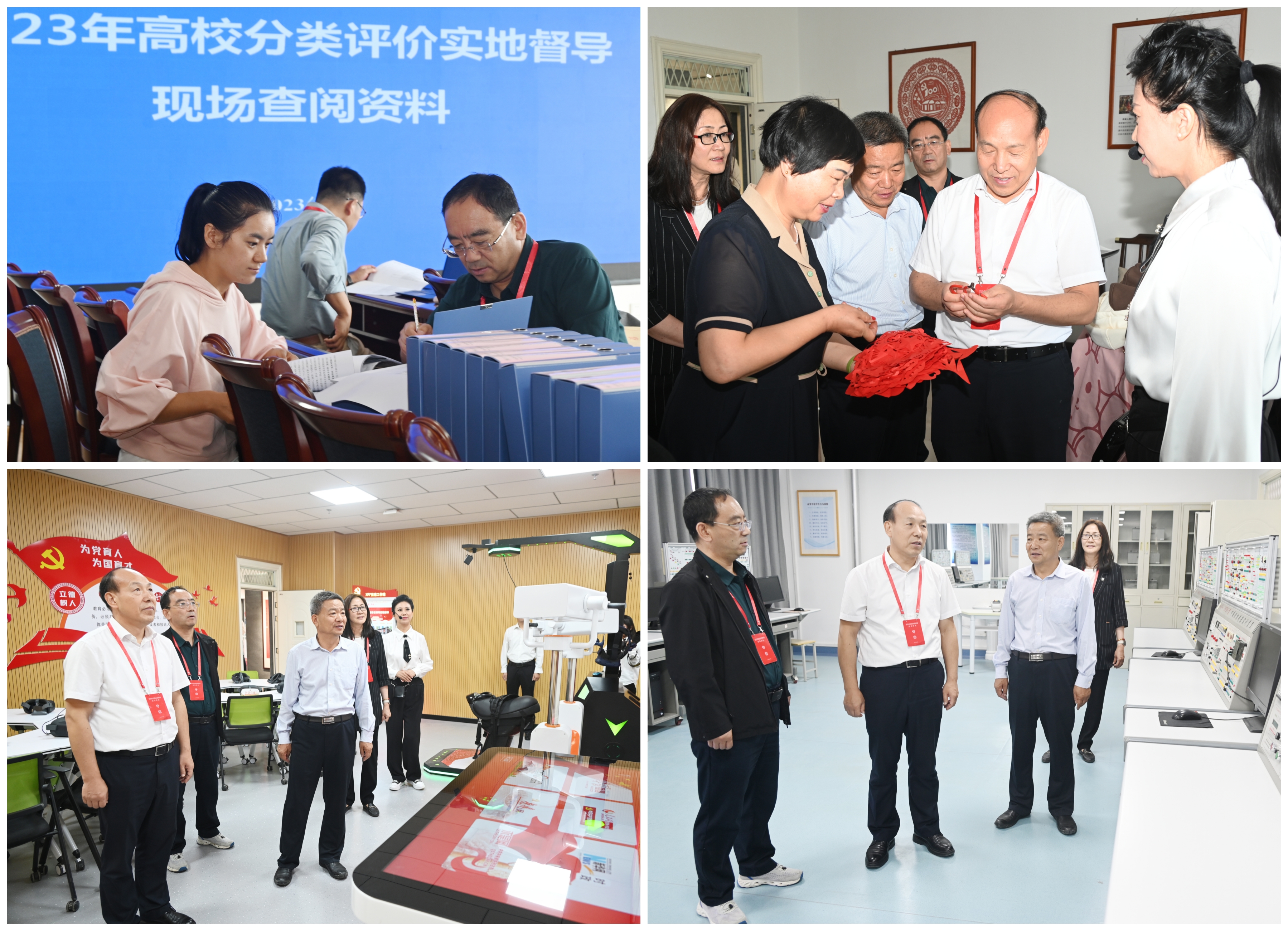 督導期間,專家組現場詳細查閱了資料,深入我校課程思政教學研究示范中心、紅色文化藝術館、名師工作室、傳統(tǒng)文化體驗中心、非遺體驗中心、VR智慧黨建體驗館、運動場所、學生食堂、公寓管理中心及中科低碳新能源技術學院專業(yè)實驗實訓室等教育教學、實驗實訓、科研平臺開展實地考察。