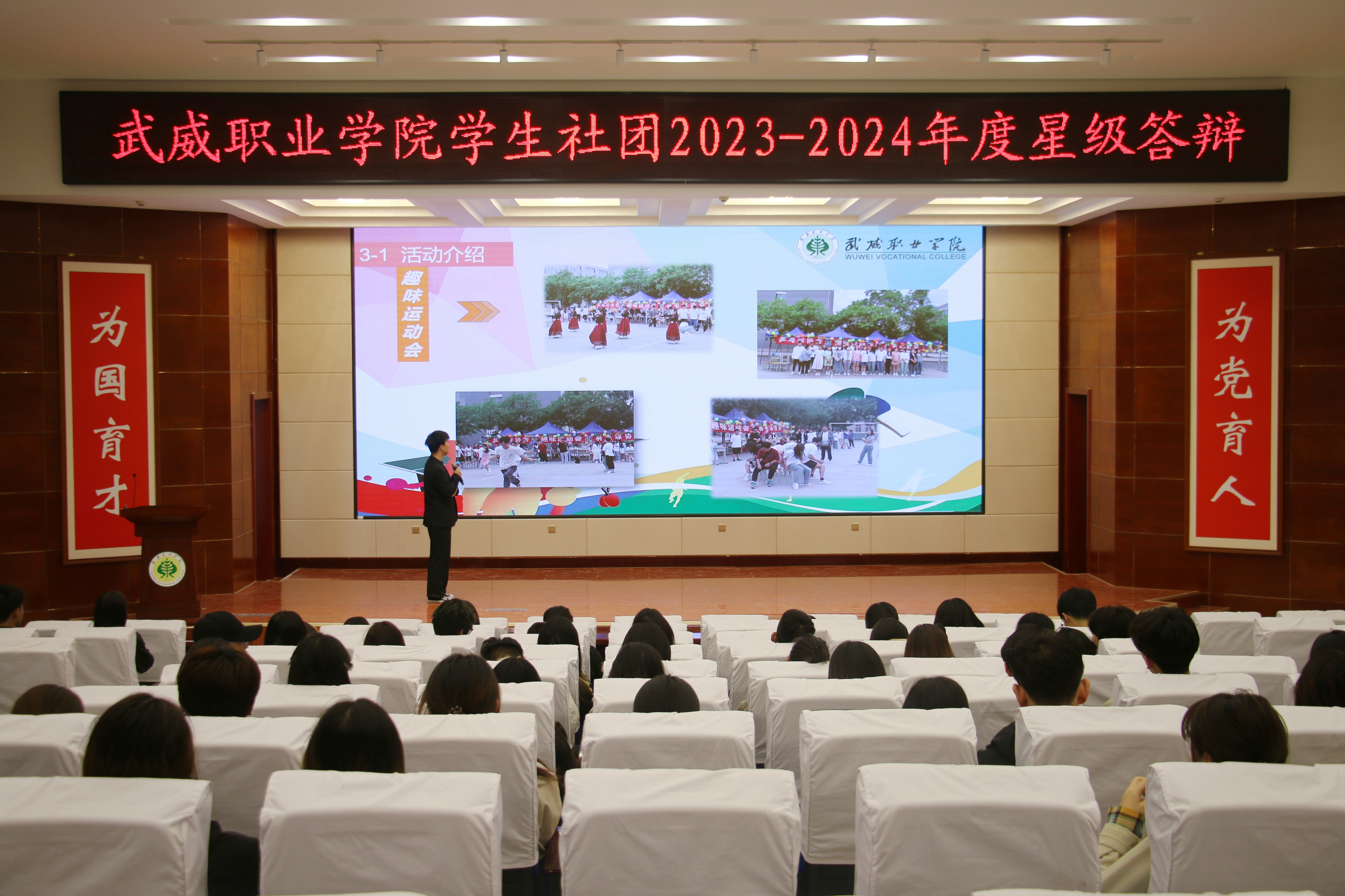 4月12日,學(xué)校在菁英廳舉辦了2023年度學(xué)生社團(tuán)星級(jí)答辯會(huì)。答辯現(xiàn)場(chǎng),各學(xué)生社團(tuán)負(fù)責(zé)人通過(guò)PPT介紹了從基本情況、活動(dòng)開(kāi)展、品牌創(chuàng)新以及未來(lái)規(guī)劃等方面進(jìn)行答辯展示。其中,新思想學(xué)習(xí)社、大學(xué)生攻鼓子藝術(shù)團(tuán)等思想引領(lǐng)類(lèi)社團(tuán)展示了文化沙龍、藝術(shù)展演等活動(dòng)情況;藍(lán)天愛(ài)心協(xié)會(huì)、大學(xué)生就業(yè)創(chuàng)業(yè)促進(jìn)會(huì)等素質(zhì)拓展型社團(tuán)展示了愛(ài)心幫扶、就業(yè)創(chuàng)業(yè)等活動(dòng);青春健康同伴社、心翼心理協(xié)會(huì)等健康類(lèi)社團(tuán)展示了健康防艾、心理咨詢(xún)等特色活動(dòng);朝陽(yáng)武術(shù)協(xié)會(huì)、羽毛球協(xié)會(huì)、乒乓球協(xié)會(huì)等體育競(jìng)技類(lèi)社團(tuán)展示了促進(jìn)大學(xué)生健康和興趣培養(yǎng)方面的體育文化活動(dòng)。最后,通過(guò)現(xiàn)場(chǎng)答辯、審核資料、社團(tuán)互評(píng)等方面綜合考量,評(píng)選出五星級(jí)學(xué)生社團(tuán)2個(gè),四星級(jí)學(xué)生社團(tuán)4個(gè),三星級(jí)社團(tuán)6個(gè)。