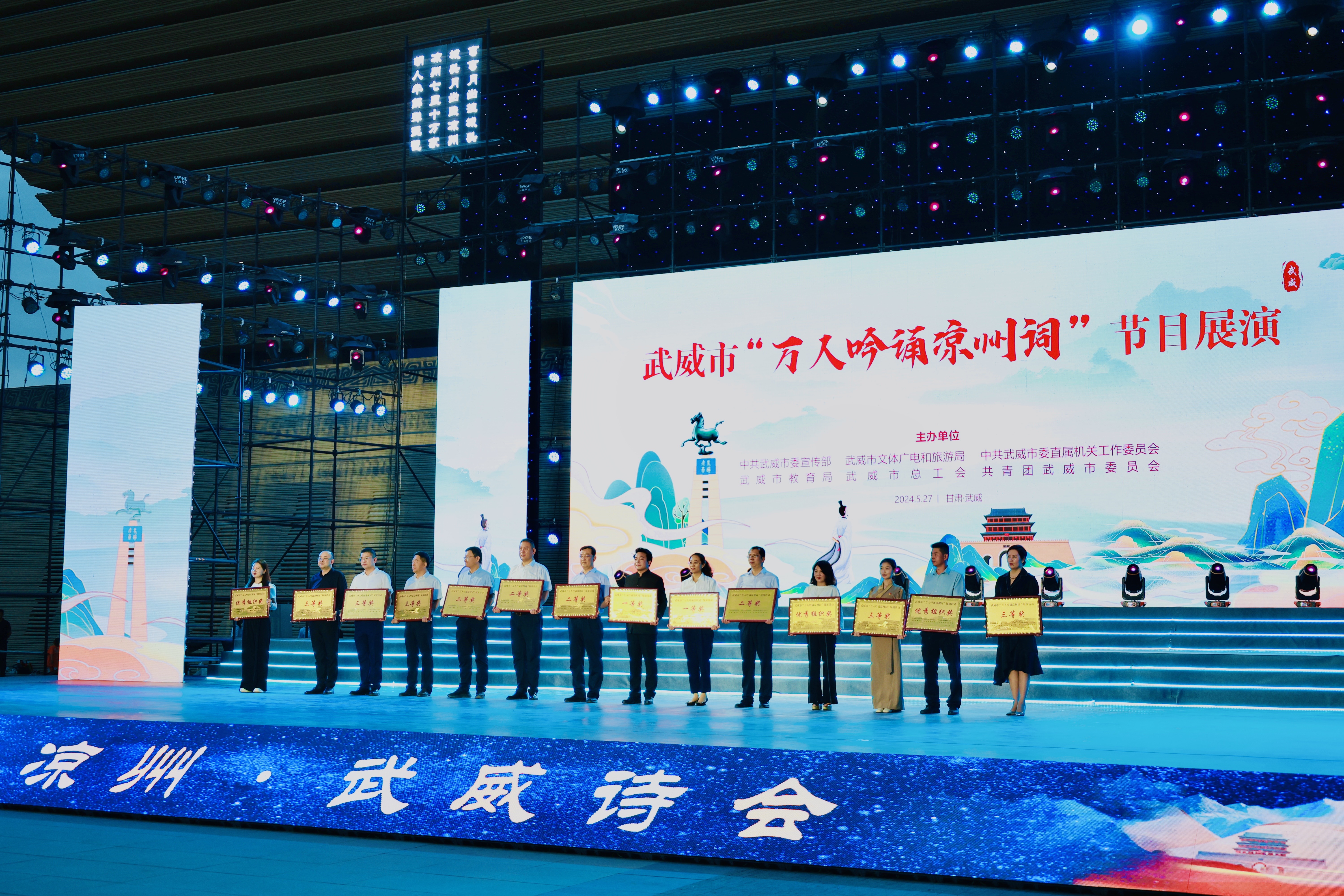5月27日晚,武威市“萬(wàn)人吟誦涼州詞”優(yōu)秀節(jié)目展演活動(dòng)在漢唐天馬城大漢賦館前舉行。我院編排的節(jié)目《詩(shī)意涼州·迤邐踏歌》榮獲一等獎(jiǎng)。