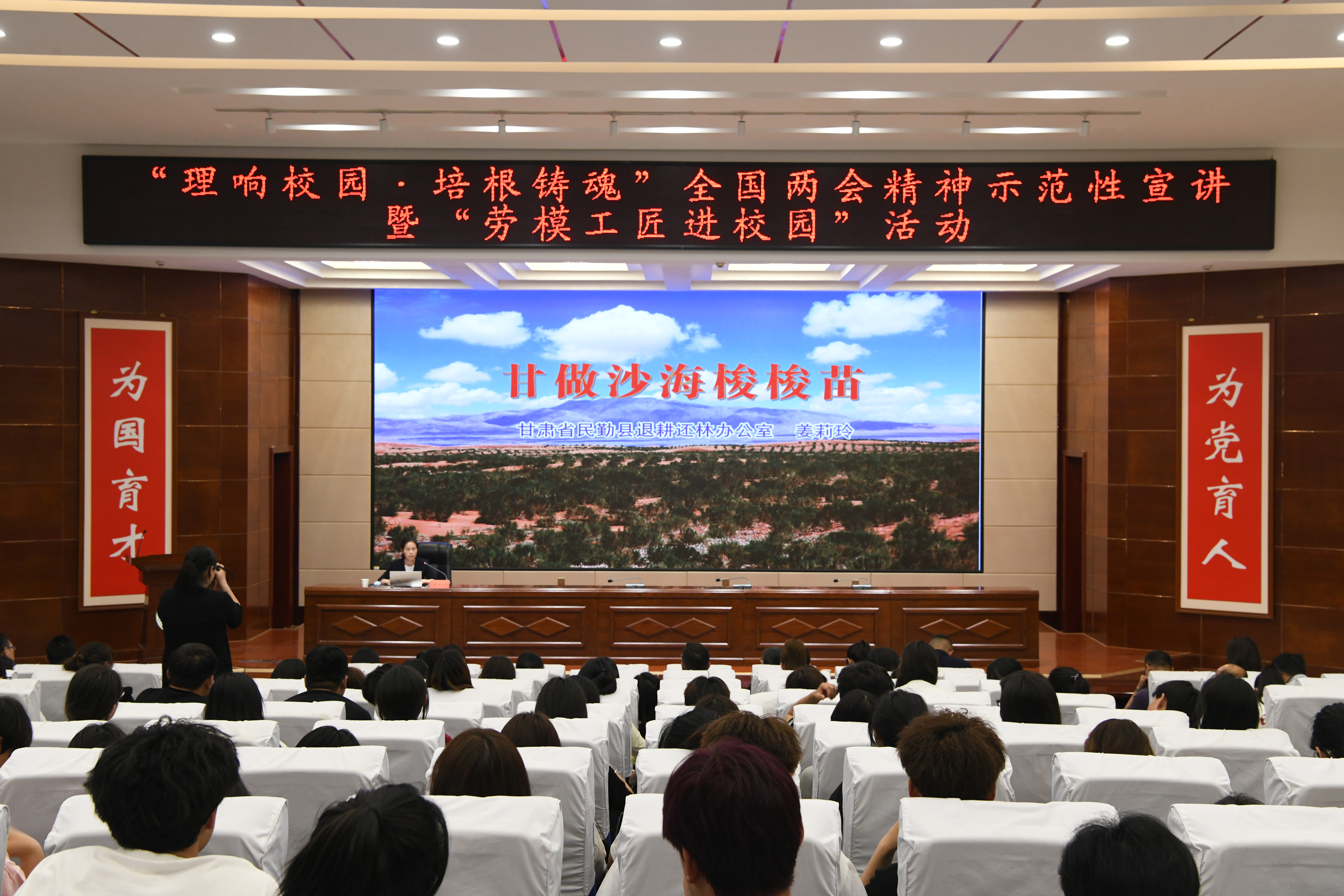 為全面深入學(xué)習(xí)領(lǐng)會習(xí)近平總書記在全國兩會期間發(fā)表的一系列重要講話精神以及全國兩會審議通過的報告和文件精神,根據(jù)省委教育工委、省總工會有關(guān)要求,5月20日上午,甘肅省“理響校園·培根鑄魂”全國兩會精神示范性宣講暨“勞模工匠進校園”活動武威職業(yè)學(xué)院專場,在學(xué)校學(xué)生發(fā)展中心菁英廳舉行。學(xué)校邀請?zhí)m州理工大學(xué)馬克思主義學(xué)院教授王海霞,武威民勤退耕還林辦公室主任、甘肅省五一巾幗獎?wù)芦@得者姜莉玲,蘭州理工大學(xué)經(jīng)管學(xué)院學(xué)生白玲玲來學(xué)校宣講。學(xué)校黨委委員、副校長何毅,宣傳統(tǒng)戰(zhàn)部負責(zé)人、師生代表共200余人參加宣講會。宣講會由何毅主持。