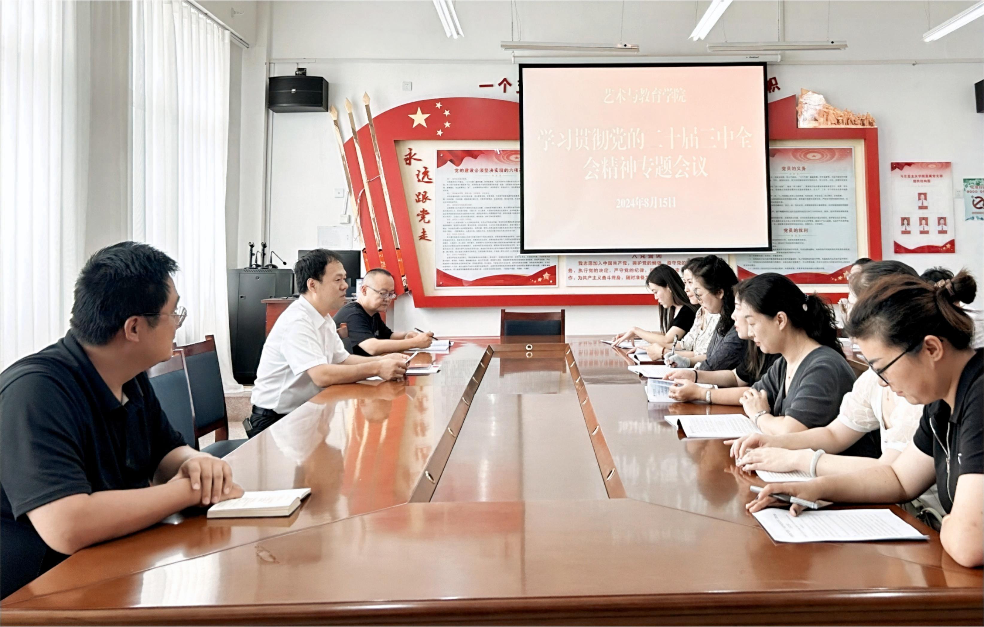 8月15日,藝術與教育學院召開黨的二十屆三中全會精神專題學習會議,傳達學習《習近平總書記關于<中共中央關于進一步全面深化改革、推進中國式現(xiàn)代化的決定>的說明》《中國共產(chǎn)黨第二十屆中央委員會第三次全體會議公報》《中共中央關于進一步全面深化改革推進中國式現(xiàn)代化的決定》,以及《深化教育綜合改革》等內(nèi)容。會議由學院黨總支書記王政主持,全體教職工參加會議。