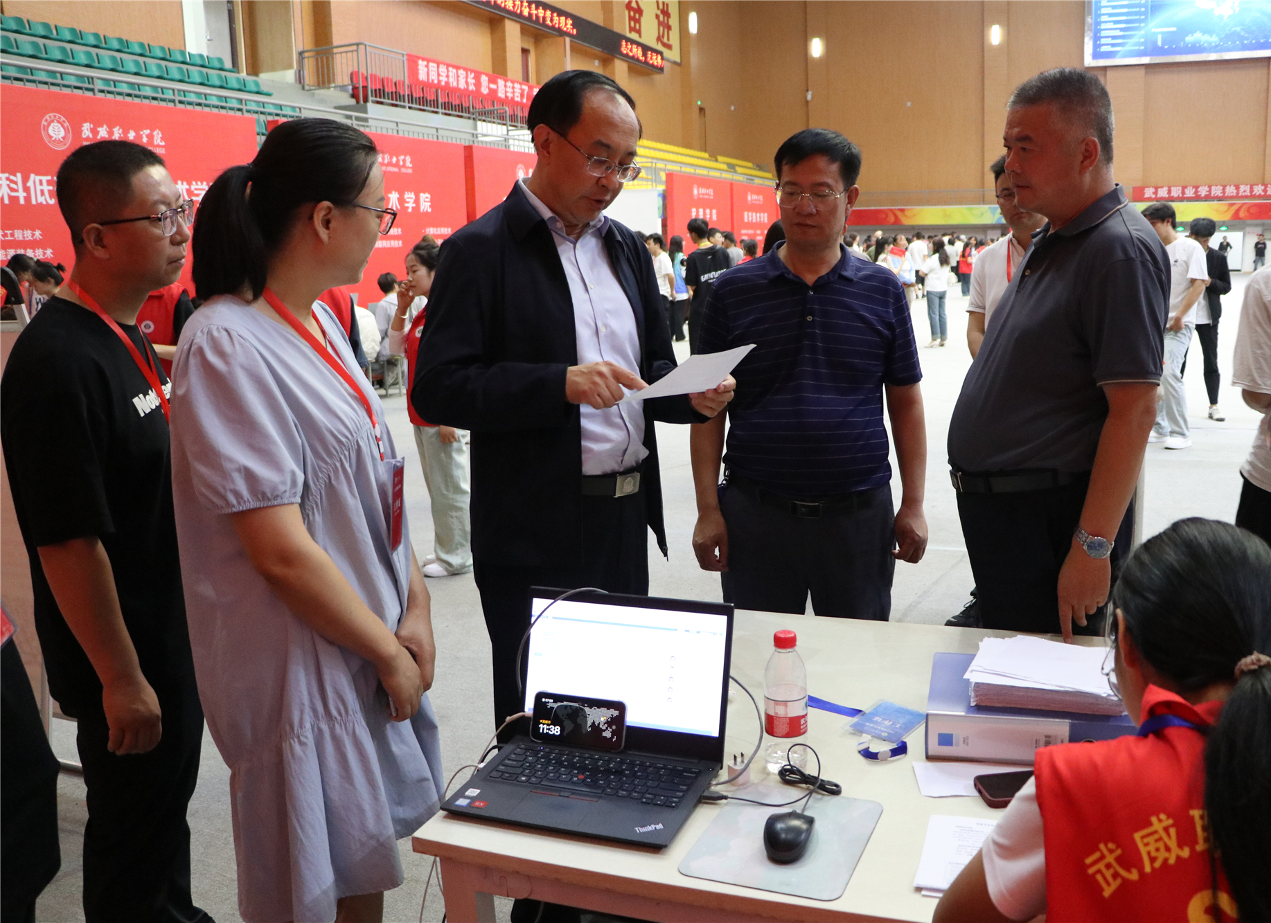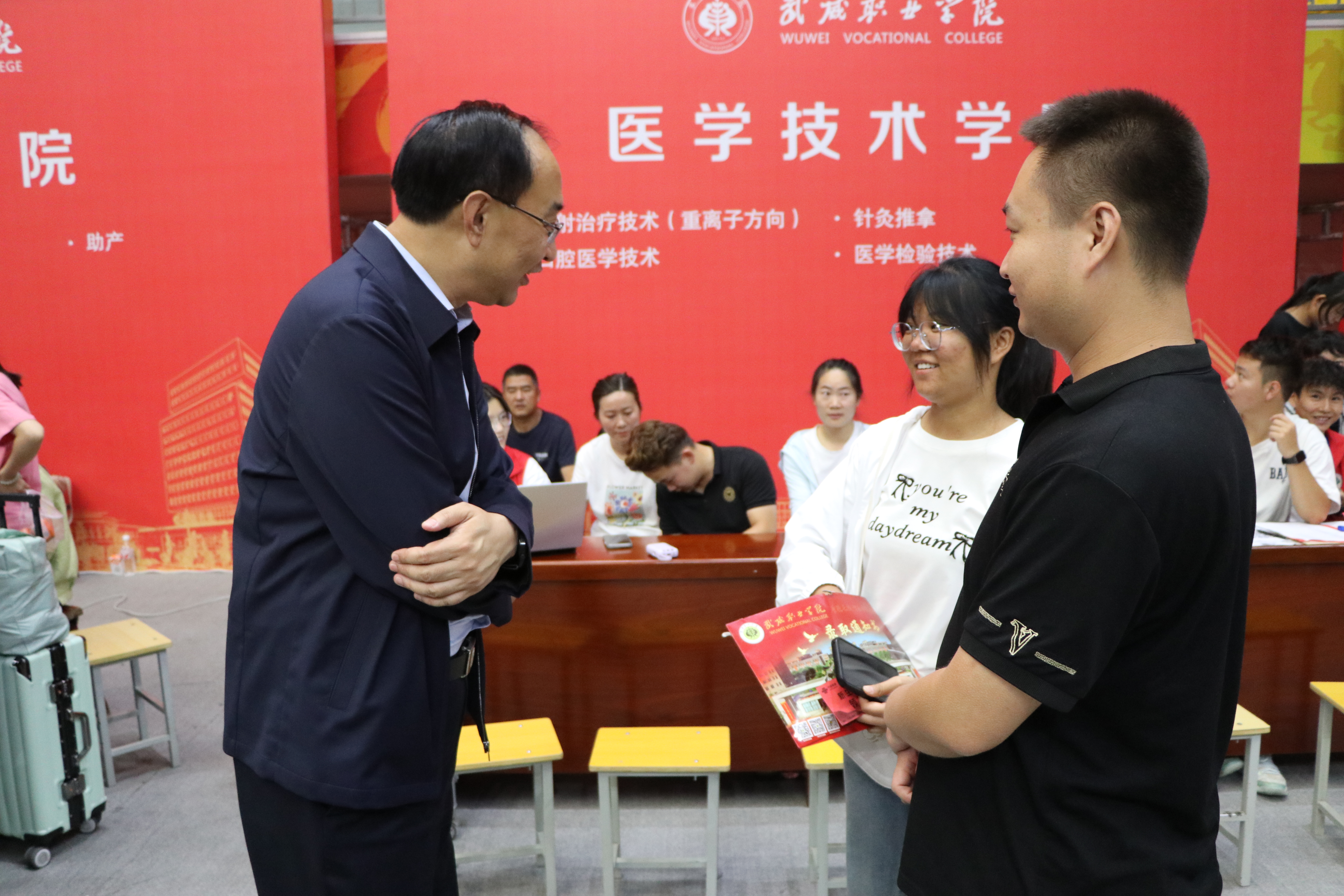 校領(lǐng)導(dǎo)一一走過新生報(bào)到處、綠色通道、繳費(fèi)處和各二級(jí)學(xué)院迎新報(bào)到點(diǎn),了解新生報(bào)到情況,仔細(xì)詢問智慧學(xué)工平臺(tái)使用情況,親切問候堅(jiān)守崗位的師生志愿者。在醫(yī)學(xué)技術(shù)學(xué)院報(bào)到點(diǎn)前,王宏與2024級(jí)放射治療技術(shù)(重離子方向)新生及家長聊了起來——“歡迎你們來到武威職業(yè)學(xué)院學(xué)習(xí)!為什么會(huì)報(bào)考這個(gè)專業(yè)?”在得知學(xué)生家庭中有人從事重離子醫(yī)療領(lǐng)域的研發(fā)工作時(shí),王宏勉勵(lì)新生要努力學(xué)好專業(yè)、練好技能,爭做高素質(zhì)技術(shù)技能人才。在家長休息區(qū),王宏與來自甘肅慶陽的新生家長親切交談,并介紹了學(xué)校的辦學(xué)情況,建議學(xué)生和家長在校園里走一走看一看,多了解熟悉學(xué)校,幫助學(xué)生盡快適應(yīng)大學(xué)生活,并祝愿學(xué)生家長在武期間,一切順利。