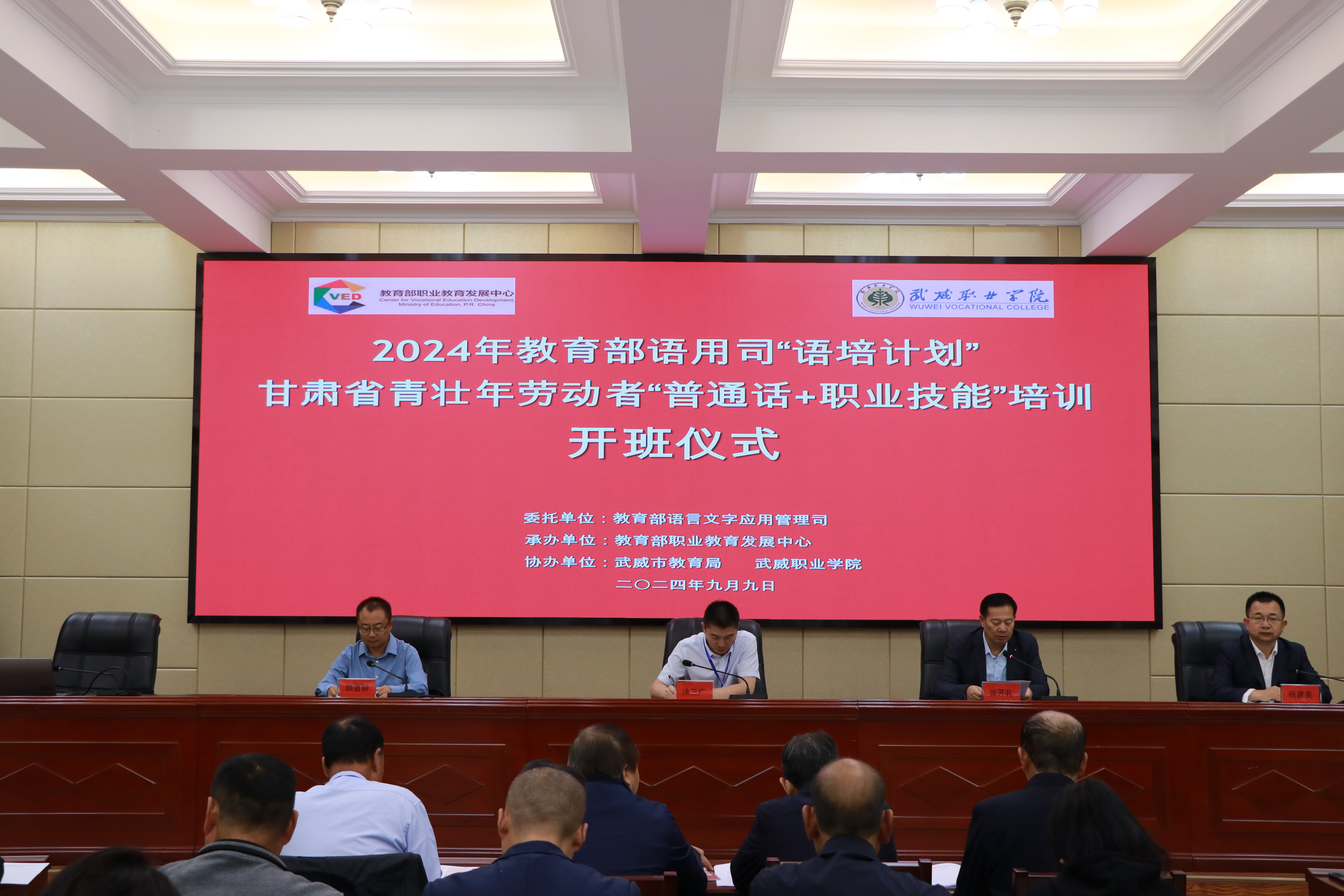9月9日上午,2024年教育部語用司“語培計劃”甘肅省青壯年勞動者“普通話+職業(yè)技能”培訓班在我校正式開班。本次培訓是深入貫徹黨的二十大精神和二十屆三中全會精神,根據教育部語用司《關于實施2024年國家通用語言文字示范性培訓計劃的通知》,受教育部語用司委托,由教育部職業(yè)教育發(fā)展中心承辦、武威市教育局、學校共同協(xié)辦。本次培訓為期5天,共有來自武威市三縣一區(qū)的50余名學員參加。培訓以“語言鋪路,技能致富”為主題,培訓內容聚焦當地農業(yè)種植技術技能和畜牧業(yè)養(yǎng)殖技能開展,以古浪“紅禿頭”小麥、民勤蜜瓜等特色農產品的栽培養(yǎng)殖技術為主線,設計了“普通話+職業(yè)技能”為主題的課程內容,邀請了國家級普通話測試員、甘肅省農業(yè)科學院專家、武威市農科所專家等組成的專家團隊。
