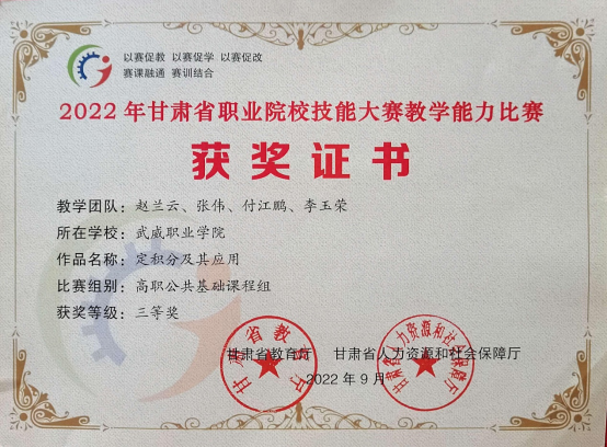 趙蘭云、張偉、 付江鵬、李玉榮 | 定積分及其應(yīng)用 | 省級(jí) | 三等 |