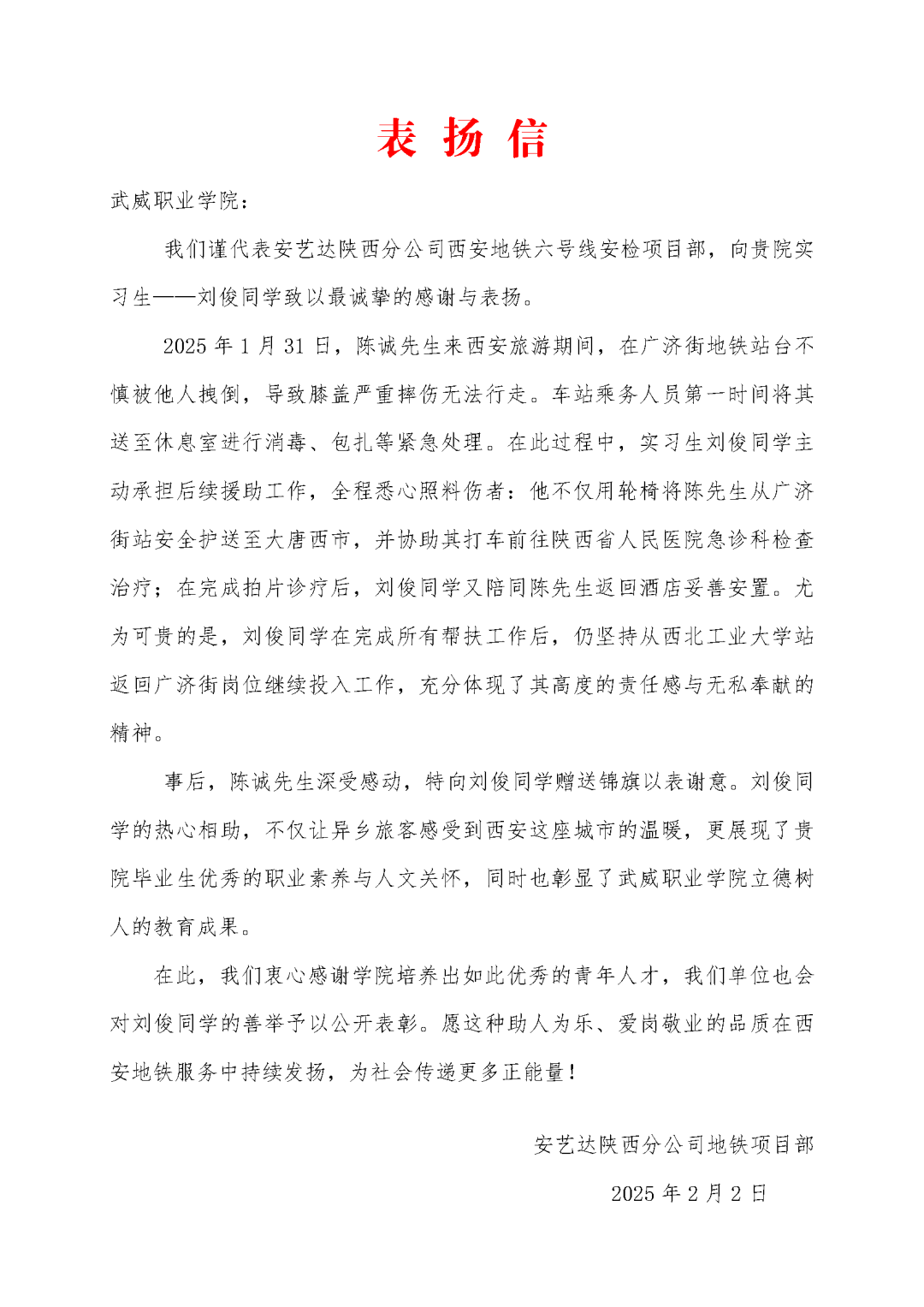 實習單位安藝達陜西分公司地鐵項目部在表揚信中特別指出:“劉俊同學在突發(fā)事件中表現(xiàn)出的應急處理能力、人文關懷意識及高度的責任感,正是新時代地鐵服務者應有的職業(yè)風范。”
